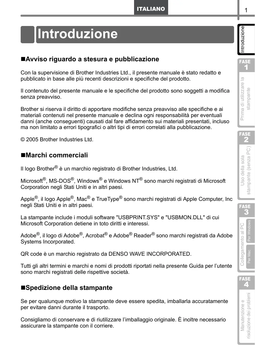 Brother si riserva il diritto di apportare modifiche senza preavviso alle specifiche e ai materiali contenuti nel presente manuale e declina ogni responsabilità per eventuali danni (anche conseguenti) causati dal fare affidamento sui materiali presentati, incluso ma non limitato a errori tipografici o altri tipi di errori correlati alla pubblicazione. © 2005 Brother Industries Ltd.