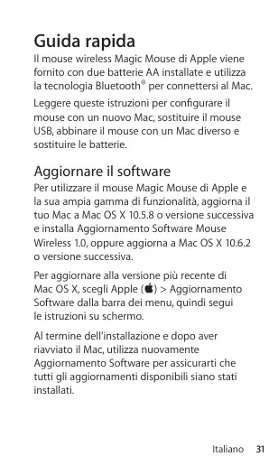 Guida rapida Il mouse wireless Magic Mouse di Apple viene fornito con due batterie AA installate e utilizza la tecnologia Bluetooth® per connettersi al Mac. Leggere queste istruzioni per configurare il mouse con un nuovo Mac, sostituire il mouse USB, abbinare il mouse con un Mac diverso e sostituire le batterie. Aggiornare il software Per utilizzare il mouse Magic Mouse di Apple e la sua ampia gamma di funzionalità, aggiorna il tuo Mac a Mac OS X 10.5.8 o versione successiva e installa Aggiornamento Software Mouse Wireless 1.0, oppure aggiorna a Mac OS X 10.6.2 o versione successiva. Per aggiornare alla versione più recente di Mac OS X, scegli Apple (K) > Aggiornamento Software dalla barra dei menu, quindi segui le istruzioni su schermo. Al termine dell’installazione e dopo aver riavviato il Mac, utilizza nuovamente Aggiornamento Software per assicurarti che tutti gli aggiornamenti disponibili siano stati installati. Italiano
