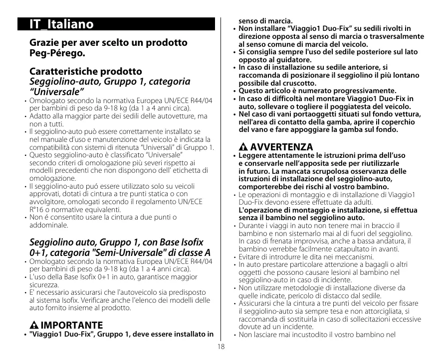 Grazie per aver scelto un prodotto Peg-Pérego. Caratteristiche prodotto Seggiolino-auto, Gruppo 1, categoria “Universale”