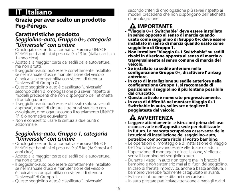 Grazie per aver scelto un prodotto Peg-Pérego. Caratteristiche prodotto Seggiolino-auto, Gruppo 0+, categoria “Universale” con cinture
