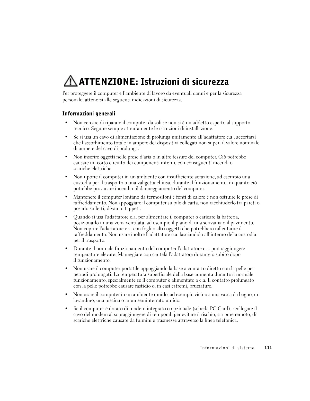 Accertarsi che non vi siano oggetti appoggiati sopra il cavo di alimentazione dell’adattatore c.a. e che il cavo non sia di intralcio o possa essere calpestato. Informazioni di sistema ATTENZIONE: Istruzioni di sicurezza (cont.)
