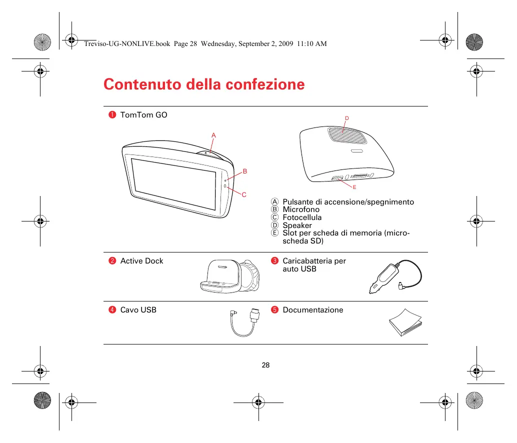 SE PS PS D 2 durer book Page 28 Wednesday, September 2, 2009 11:10 AM NA œ A re T Contenuto della confezione T © TomTom GO Pulsante di accensione/spegnimento Microfono Fotocellula ds Speaker EE Slot per scheda di memoria (micro- scheda SD) © Active Dock © Caricabatteria per auto USB © Cavo USB = © Documentazione F D S 28 PS