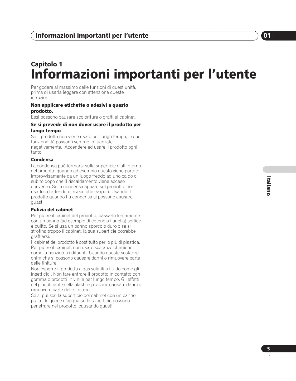 La condensa può formarsi sulla superficie o all’interno del prodotto quando ad esempio questo viene portato improvvisamente da un luogo freddo ad uno caldo o subito dopo che il riscaldamento viene acceso d’inverno. Se la condensa appare sul prodotto, non usarlo ed attendere invece che evapori. Usando il prodotto quando ha condensa si possono causare guasti.