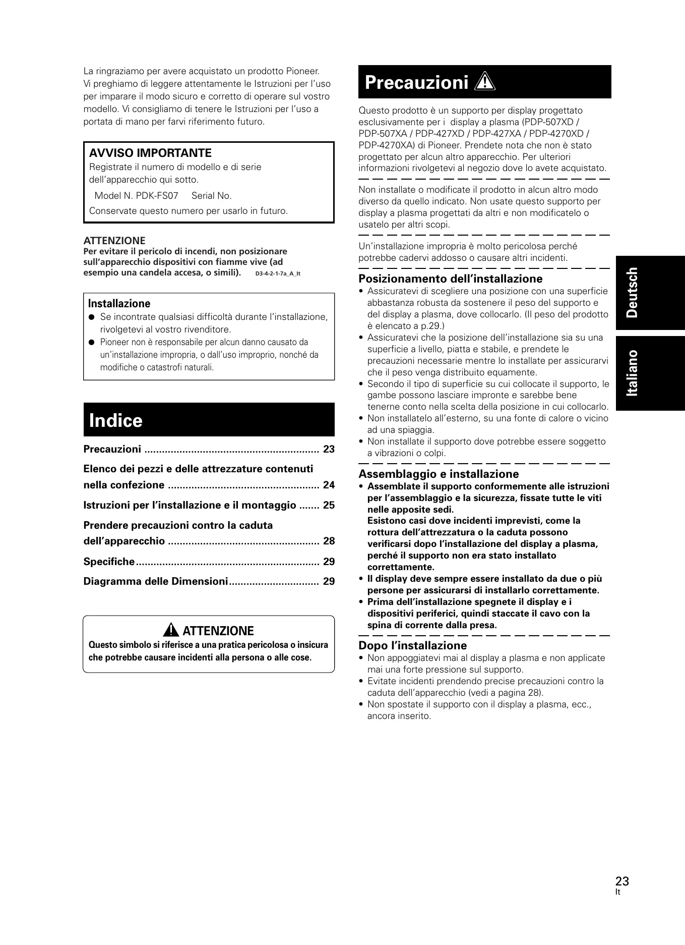 - Registrate il numero di modello e di serie dell’apparecchio qui sotto. Model N. PDK-FS07 Serial No. Conservate questo numero per usarlo in futuro. ATTENZIONE Per evitare il pericolo di incendi, non posizionare sull’apparecchio dispositivi con fiamme vive (ad D3-4-2-1-7a_A_It esempio una candela accesa, o simili). Installazione ¶ Se incontrate qualsiasi difficoltà durante l’installazione, rivolgetevi al vostro rivenditore. ¶ Pioneer non è responsabile per alcun danno causato da un’installazione impropria, o dall’uso improprio, nonché da modifiche o catastrofi naturali. Indice Precauzioni p. 23