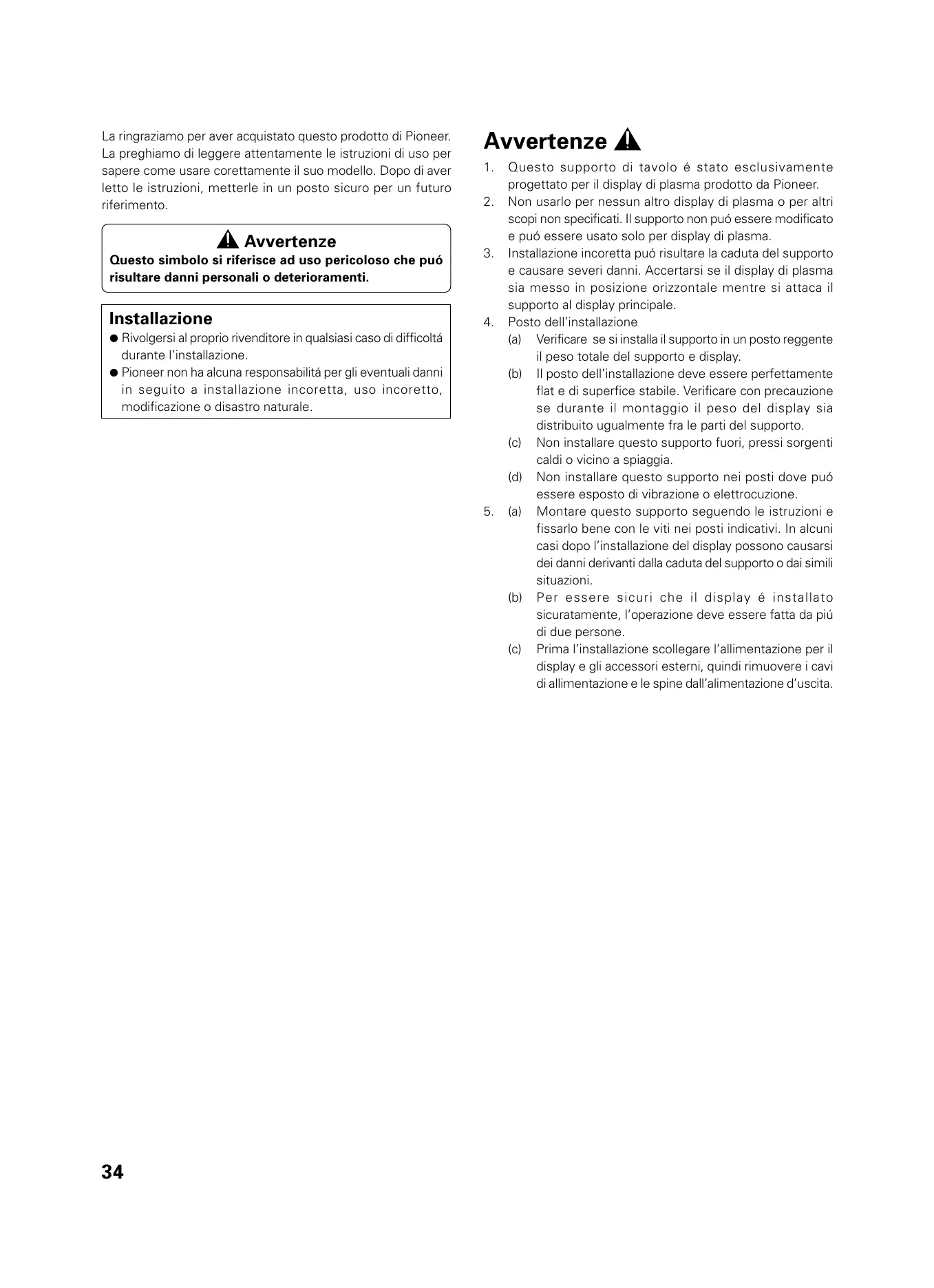 Questo supporto di tavolo é stato esclusivamente progettato per il display di plasma prodotto da Pioneer. Non usarlo per nessun altro display di plasma o per altri scopi non specificati. Il supporto non puó essere modificato e puó essere usato solo per display di plasma. Installazione incoretta puó risultare la caduta del supporto e causare severi danni. Accertarsi se il display di plasma sia messo in posizione orizzontale mentre si attaca il supporto al display principale. Posto dell’installazione (a) Verificare se si installa il supporto in un posto reggente il peso totale del supporto e display. (b) Il posto dell’installazione deve essere perfettamente flat e di superfice stabile. Verificare con precauzione se durante il montaggio il peso del display sia distribuito ugualmente fra le parti del supporto. (c) Non installare questo supporto fuori, pressi sorgenti caldi o vicino a spiaggia. (d) Non installare questo supporto nei posti dove puó essere esposto di vibrazione o elettrocuzione. (a) Montare questo supporto seguendo le istruzioni e fissarlo bene con le viti nei posti indicativi. In alcuni casi dopo l’installazione del display possono causarsi dei danni derivanti dalla caduta del supporto o dai simili situazioni. (b) Per essere sicuri che il display é installato sicuratamente, l’operazione deve essere fatta da piú di due persone. (c) Prima l’installazione scollegare l’allimentazione per il display e gli accessori esterni, quindi rimuovere i cavi di allimentazione e le spine dall’alimentazione d’uscita.
