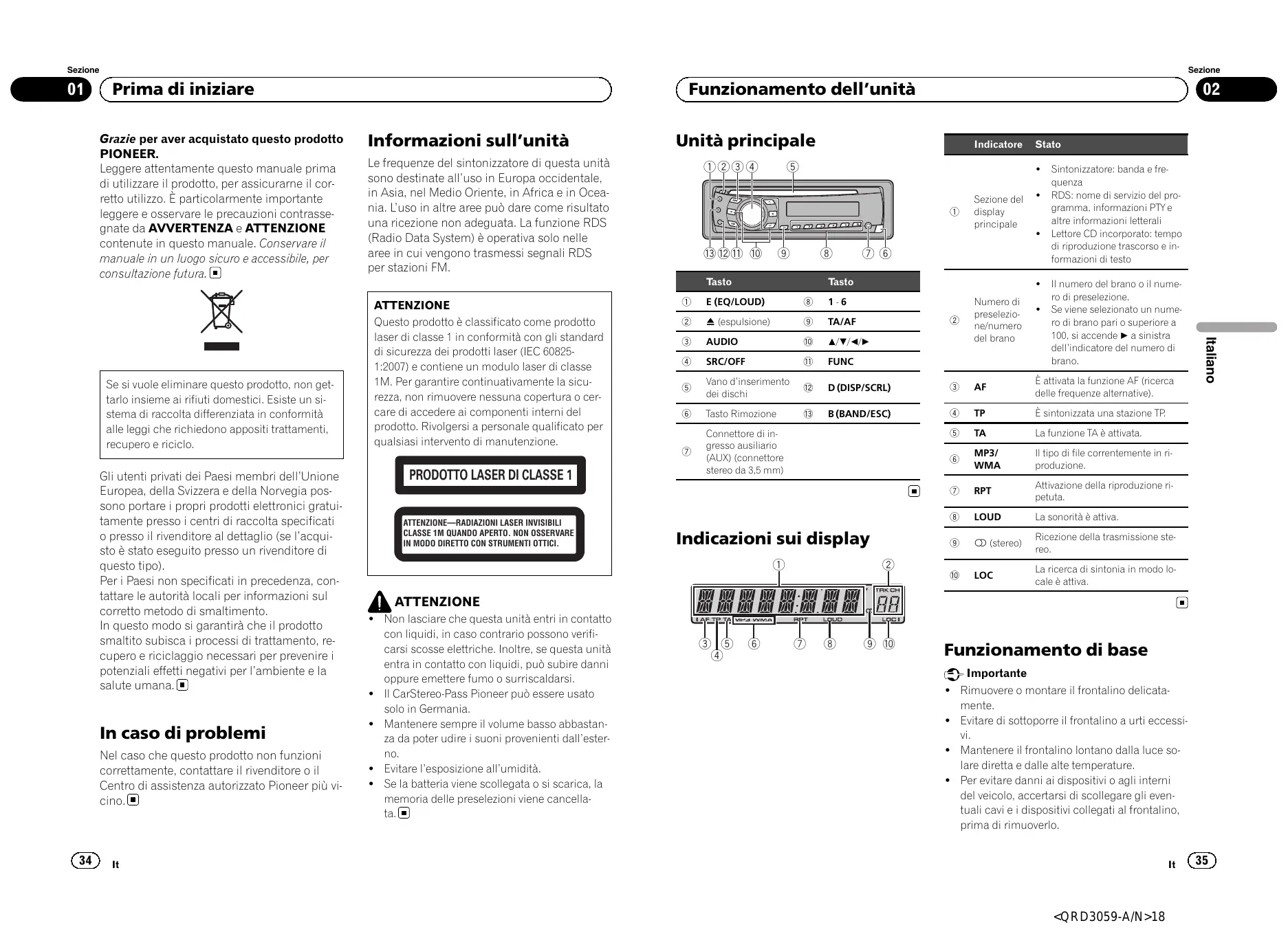 Sezione [ _o1] (Prima di iniziare (Funzionamento dell'unità Grazie per aver acquistato questo prodotto PIONEER. Leggere attentamente questo manuale prima di utilizzare il prodotto, per assicurarne il cor- retto utilizzo. Ë particolarmente importante leggere e osservare le precauzioni contrasse- gnate da AVVERTENZA € ATTENZIONE contenute in questo manuale. Conservare il manuale in un luogo sicuro e accessibile, per consultazione futura. (=) Se si vuole eliminare questo prodotto, non get- tarlo insieme ai rifiuti domestici. Esiste un si stema di raccolta differenziata in conformità alle leggi che richiedono appositi trattamenti, recupero e riciclo. Gli utenti privati dei Paesi membri dell'Unione Europea, della Svizzera e della Norvegia pos- sono portare i propri prodotti elettronici gratui- tamente presso i centri di raccolta specificati © presso il rivenditore al dettaglio (se l'acqui- sto à stato eseguito presso un rivenditore di questo tipo). Per i Paesi non specificati in precedenza, con- tattare le autorità locali per informazioni sul corretto metodo di smaltimento. In questo modo si garantirà che il prodotto smaltito subisca i processi di trattamento, re- cupero e riciclaggio necessari per prevenire i potenziali effetti negativi per l'ambiente e la salute umana. (s) In caso di problemi Nel caso che questo prodotto non funzioni correttamente, contattare il rivenditore o il Centro di assistenza autorizzato Pioneer più vi- cino.(") GD n Informazioni sull'unità Le frequenze del sintonizzatore di questa unità sono destinate all’uso in Europa occidentale, in Asia, nel Medio Oriente, in Africa e in Ocea- nia. L'uso in altre aree puè dare come risultato una ricezione non adeguata. La funzione RDS {Radio Data System) à operativa solo nelle aree in cui vengono trasmessi segnali RDS per stazioni FM. ATTENZIONE Questo prodotto à classificato come prodotto laser di classe 1 in conformità con gli standard di sicurezza dei prodotti laser (IEC 60825- 1:2007) e contiene un modulo laser di classe 1M. Per garantire continuativamente la sicu- rezza, non rimuovere nessuna copertura 0 cer- care di accedere ai componenti interni del prodotto. Rivolgersi à personale qualificato per qualsiasi intervento di manutenzione.