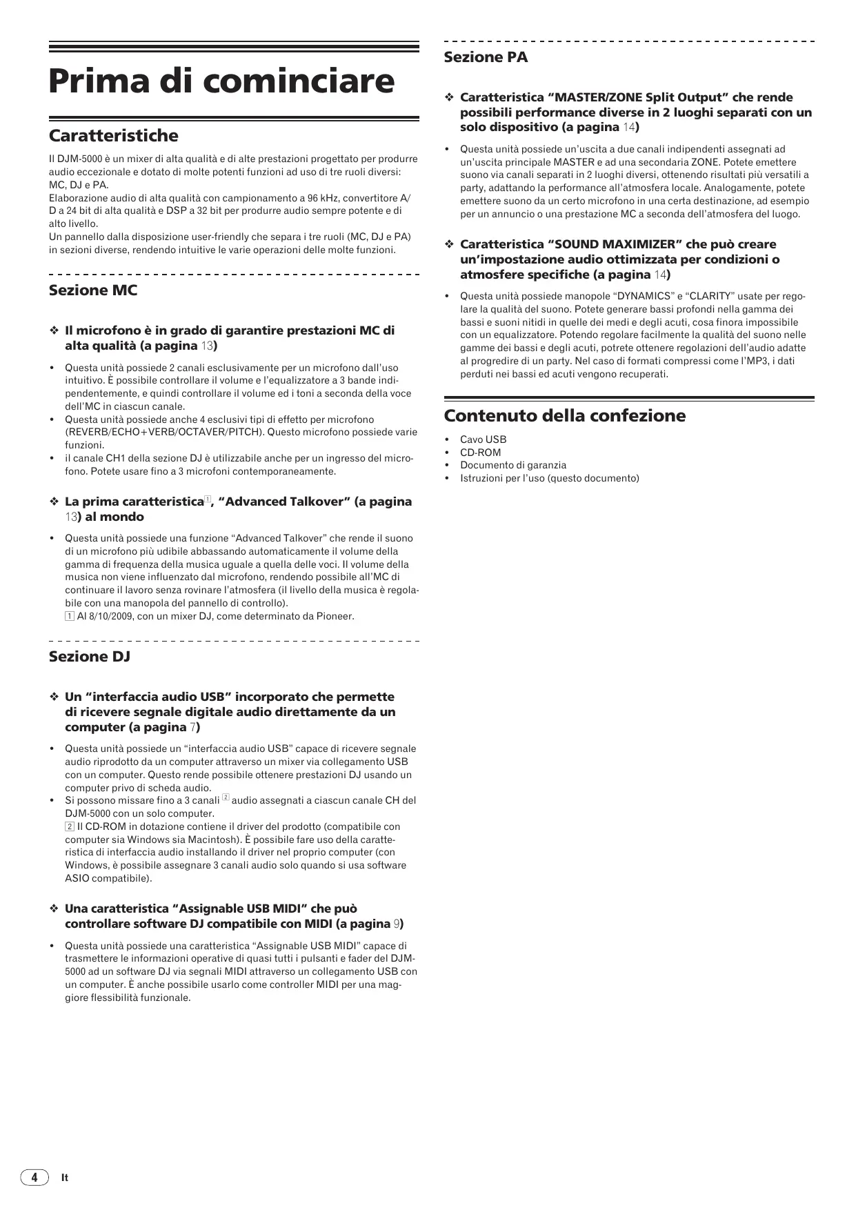 Questa unità possiede una funzione “Advanced Talkover” che rende il suono di un microfono più udibile abbassando automaticamente il volume della gamma di frequenza della musica uguale a quella delle voci. Il volume della musica non viene influenzato dal microfono, rendendo possibile all’MC di continuare il lavoro senza rovinare l’atmosfera (il livello della musica è regolabile con una manopola del pannello di controllo). 1 Al 8/10/2009, con un mixer DJ, come determinato da Pioneer. Sezione DJ Un “interfaccia audio USB” incorporato che permette di ricevere segnale digitale audio direttamente da un computer (a pagina 7)