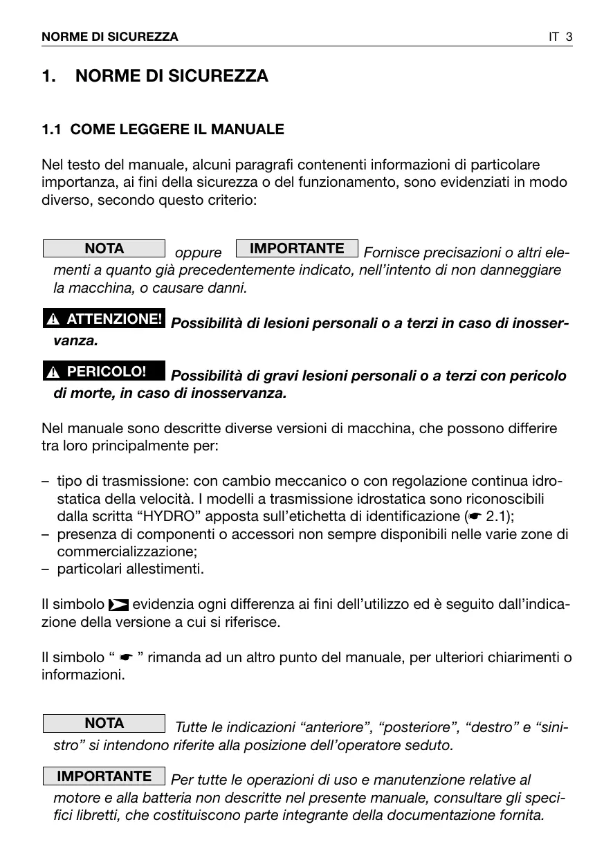 IMPORTANTE Per tutte le operazioni di uso e manutenzione relative al motore e alla batteria non descripte nel presente manuale, consultare gli specifici libretti, che costituiscono parte integrante della documentazione fornita.
