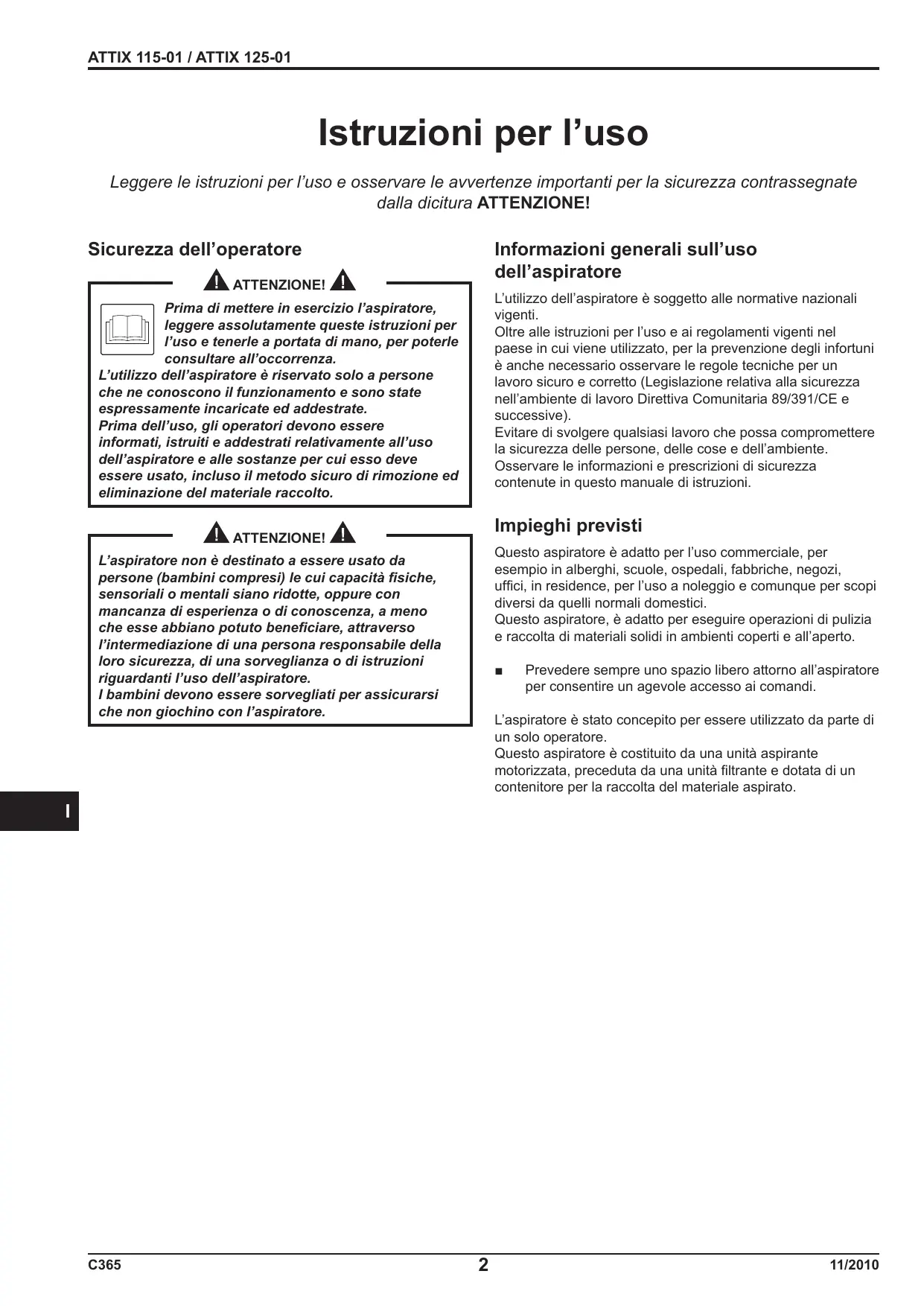 Istruzioni per l’uso Leggere le istruzioni per l’uso e osservare le avvertenze importanti per la sicurezza contrassegnate dalla dicitura ATTENZIONE! Sicurezza dell’operatore Informazioni generali sull’uso dell’aspiratore ATTENZIONE! L’utilizzo dell’aspiratore è soggetto alle normative nazionali vigenti. Oltre alle istruzioni per l’uso e ai regolamenti vigenti nel paese in cui viene utilizzato, per la prevenzione degli infortuni è anche necessario osservare le regole tecniche per un lavoro sicuro e corretto (Legislazione relativa alla sicurezza nell’ambiente di lavoro Direttiva Comunitaria 89/391/CE e successive). Evitare di svolgere qualsiasi lavoro che possa compromettere la sicurezza delle persone, delle cose e dell’ambiente. Osservare le informazioni e prescrizioni di sicurezza contenute in questo manuale di istruzioni. Prima di mettere in esercizio l’aspiratore, leggere assolutamente queste istruzioni per l’uso e tenerle a portata di mano, per poterle consultare all’occorrenza. L’utilizzo dell’aspiratore è riservato solo a persone che ne conoscono il funzionamento e sono state espressamente incaricate ed addestrate. Prima dell’uso, gli operatori devono essere informati, istruiti e addestrati relativamente all’uso dell’aspiratore e alle sostanze per cui esso deve essere usato, incluso il metodo sicuro di rimozione ed eliminazione del materiale raccolto. Impieghi previsti ATTENZIONE! Questo aspiratore è adatto per l’uso commerciale, per esempio in alberghi, scuole, ospedali, fabbriche, negozi, uffici, in residence, per l’uso a noleggio e comunque per scopi diversi da quelli normali domestici. Questo aspiratore, è adatto per eseguire operazioni di pulizia e raccolta di materiali solidi in ambienti coperti e all’aperto. L’aspiratore non è destinato a essere usato da persone (bambini compresi) le cui capacità fisiche, sensoriali o mentali siano ridotte, oppure con mancanza di esperienza o di conoscenza, a meno che esse abbiano potuto beneficiare, attraverso l’intermediazione di una persona responsabile della loro sicurezza, di una sorveglianza o di istruzioni riguardanti l’uso dell’aspiratore. I bambini devono essere sorvegliati per assicurarsi che non giochino con l’aspiratore.