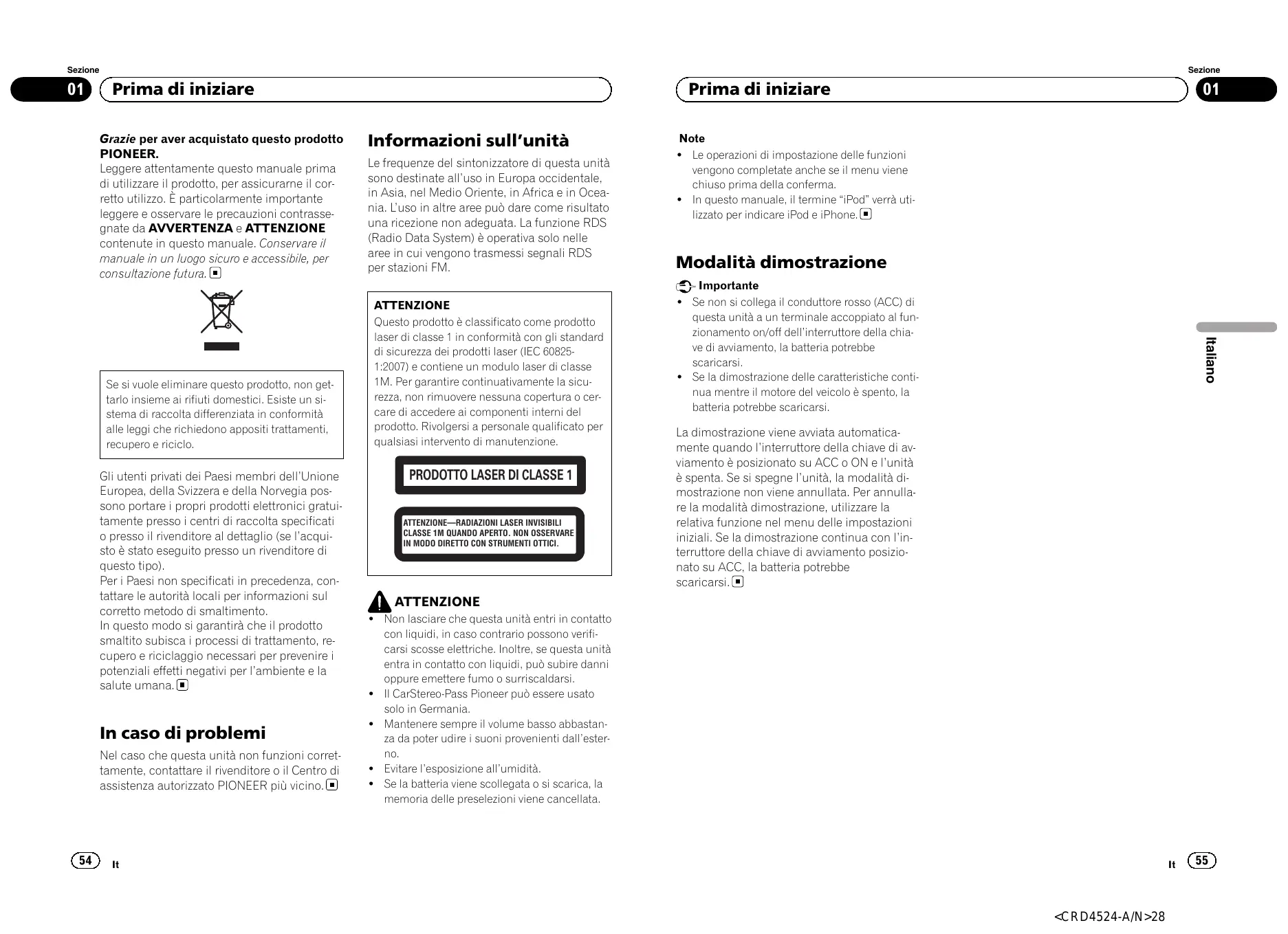 Informazioni sull’unità Le frequenze del sintonizzatore di questa unità sono destinate all’uso in Europa occidentale, in Asia, nel Medio Oriente, in Africa e in Oceania. L’uso in altre aree può dare come risultato una ricezione non adeguata. La funzione RDS (Radio Data System) è operativa solo nelle aree in cui vengono trasmessi segnali RDS per stazioni FM. ATTENZIONE Questo prodotto è classificato come prodotto laser di classe 1 in conformità con gli standard di sicurezza dei prodotti laser (IEC 608251:2007) e contiene un modulo laser di classe 1M. Per garantire continuativamente la sicurezza, non rimuovere nessuna copertura o cercare di accedere ai componenti interni del prodotto. Rivolgersi a personale qualificato per qualsiasi intervento di manutenzione.