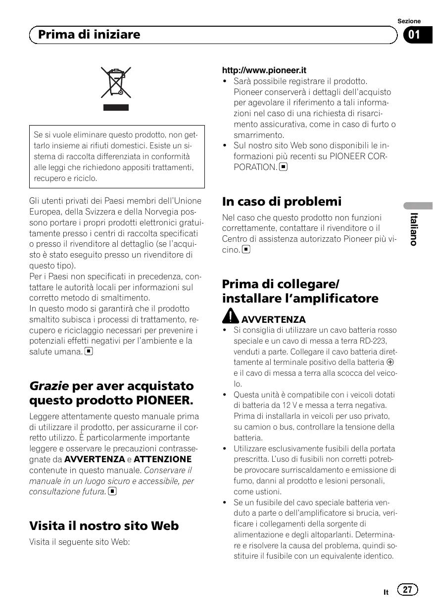 Niveau d’entrée maximal/impédance : RCA ...................................... 6,5 V/22 kW Haut-parleur ..................... 26 V/22 kW Remarques ! Les caractéristiques et la présentation peuvent être modifiées sans avis préalable. ! Le courant extrait moyen correspond quasiment au courant maximal extrait par cet appareil lors de l’entrée d’un signal audio. Utilisez cette valeur lors du calcul du courant total extrait par plusieurs amplificateurs. Sezione Prima di iniziare Se si vuole eliminare questo prodotto, non gettarlo insieme ai rifiuti domestici. Esiste un sistema di raccolta differenziata in conformità alle leggi che richiedono appositi trattamenti, recupero e riciclo. Grazie per aver acquistato questo prodotto PIONEER. Leggere attentamente questo manuale prima di utilizzare il prodotto, per assicurarne il corretto utilizzo. È particolarmente importante leggere e osservare le precauzioni contrassegnate da AVVERTENZA e ATTENZIONE contenute in questo manuale. Conservare il manuale in un luogo sicuro e accessibile, per consultazione futura. Visita il nostro sito Web Visita il seguente sito Web: http://www.pioneer.it ! Sarà possibile registrare il prodotto. Pioneer conserverà i dettagli dell’acquisto per agevolare il riferimento a tali informazioni nel caso di una richiesta di risarcimento assicurativa, come in caso di furto o smarrimento. ! Sul nostro sito Web sono disponibili le informazioni più recenti su PIONEER CORPORATION. In caso di problemi Nel caso che questo prodotto non funzioni correttamente, contattare il rivenditore o il Centro di assistenza autorizzato Pioneer più vicino. Italiano Gli utenti privati dei Paesi membri dell’Unione Europea, della Svizzera e della Norvegia possono portare i propri prodotti elettronici gratuitamente presso i centri di raccolta specificati o presso il rivenditore al dettaglio (se l’acquisto è stato eseguito presso un rivenditore di questo tipo). Per i Paesi non specificati in precedenza, contattare le autorità locali per informazioni sul corretto metodo di smaltimento. In questo modo si garantirà che il prodotto smaltito subisca i processi di trattamento, recupero e riciclaggio necessari per prevenire i potenziali effetti negativi per l’ambiente e la salute umana.