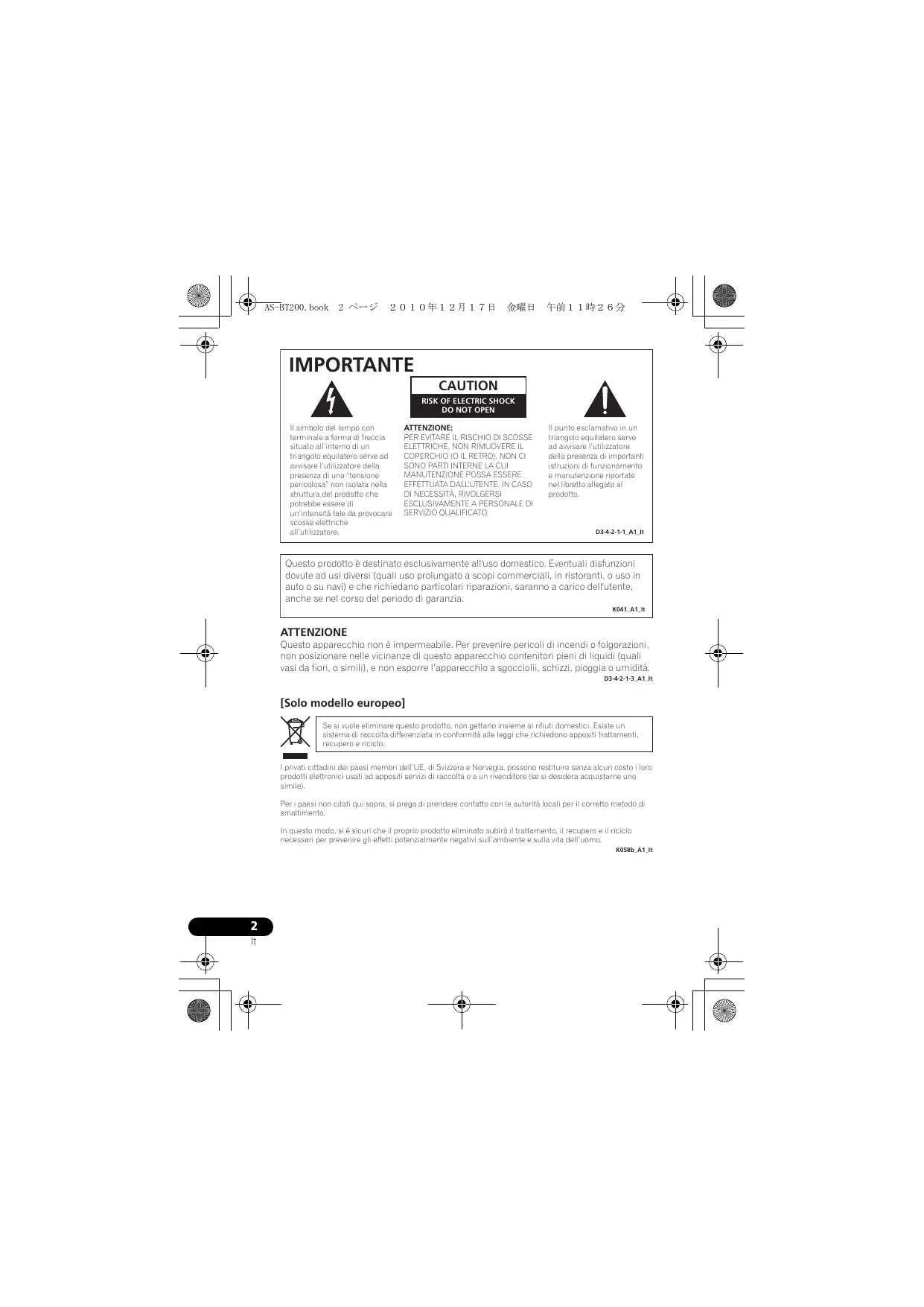 ATTENZIONE Questo apparecchio non è impermeabile. Per prevenire pericoli di incendi o folgorazioni, non posizionare nelle vicinanze di questo apparecchio contenitori pieni di liquidi (quali vasi da fiori, o simili), e non esporre l’apparecchio a sgocciolii, schizzi, pioggia o umidità. D3-4-2-1-3_A1_It