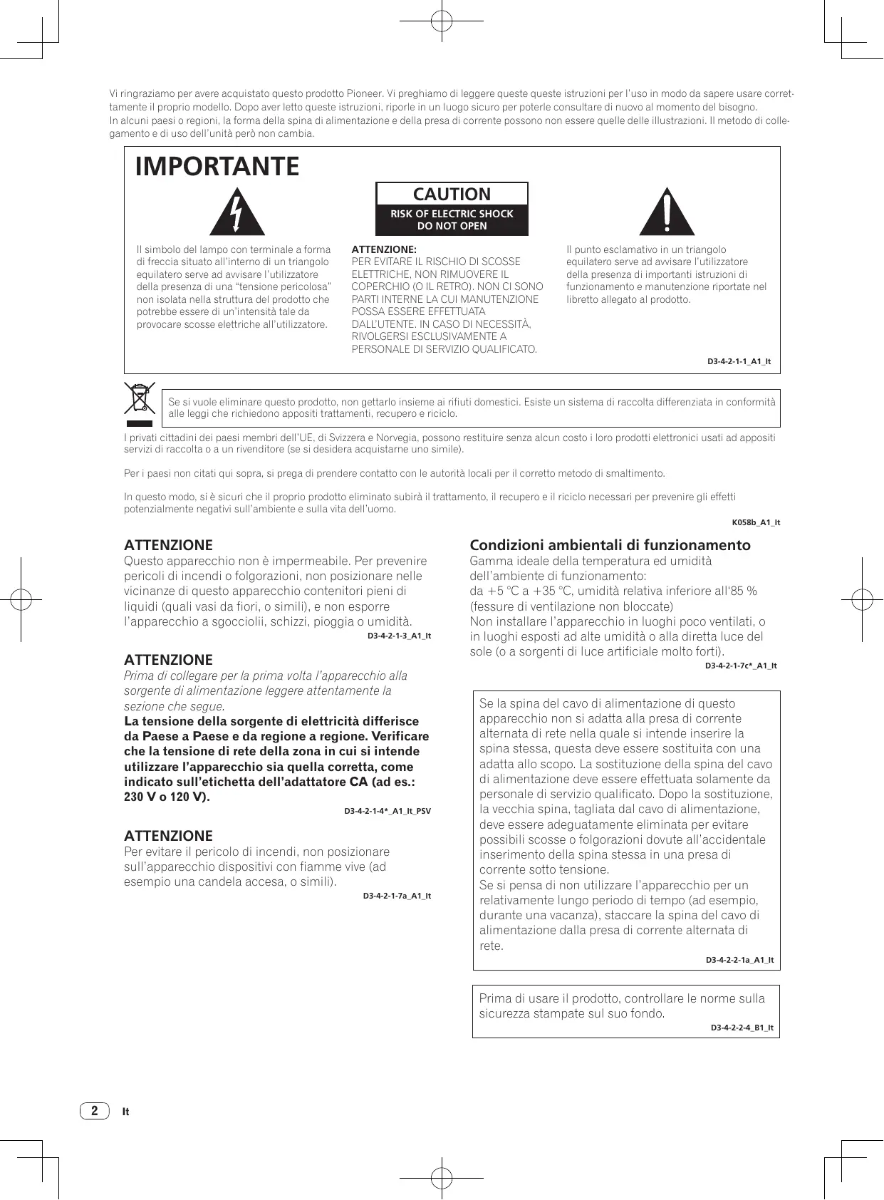 Vi ringraziamo per avere acquistato questo prodotto Pioneer. Vi preghiamo di leggere queste queste istruzioni per l’uso in modo da sapere usare correttamente il proprio modello. Dopo aver letto queste istruzioni, riporle in un luogo sicuro per poterle consultare di nuovo al momento del bisogno. In alcuni paesi o regioni, la forma della spina di alimentazione e della presa di corrente possono non essere quelle delle illustrazioni. Il metodo di collegamento e di uso dell’unità però non cambia. IMPORTANTE CAUTION