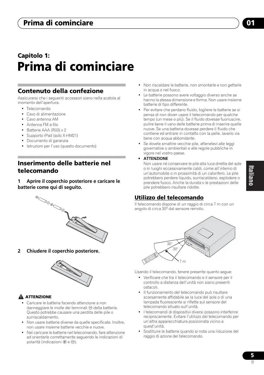 English Capitolo 1: Prima di cominciare 1 Aprire il coperchio posteriore e caricare le batterie come qui di seguito. Il telecomando dispone di un raggio di circa 7 m con un angolo di circa 30º dal sensore remoto.