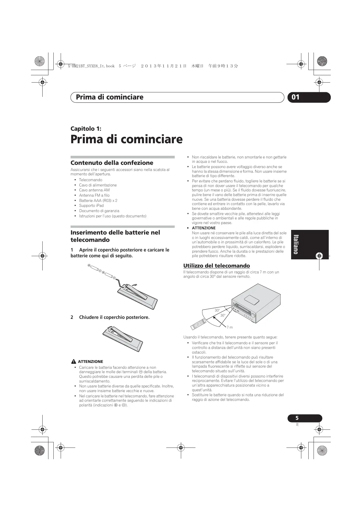 Chiudere il coperchio posteriore. 30° Español INPU 30° Nederlands Utilizzo del telecomando Italiano Inserimento delle batterie nel telecomando Deutsch Assicurarsi che i seguenti accessori siano nella scatola al momento dell’apertura.