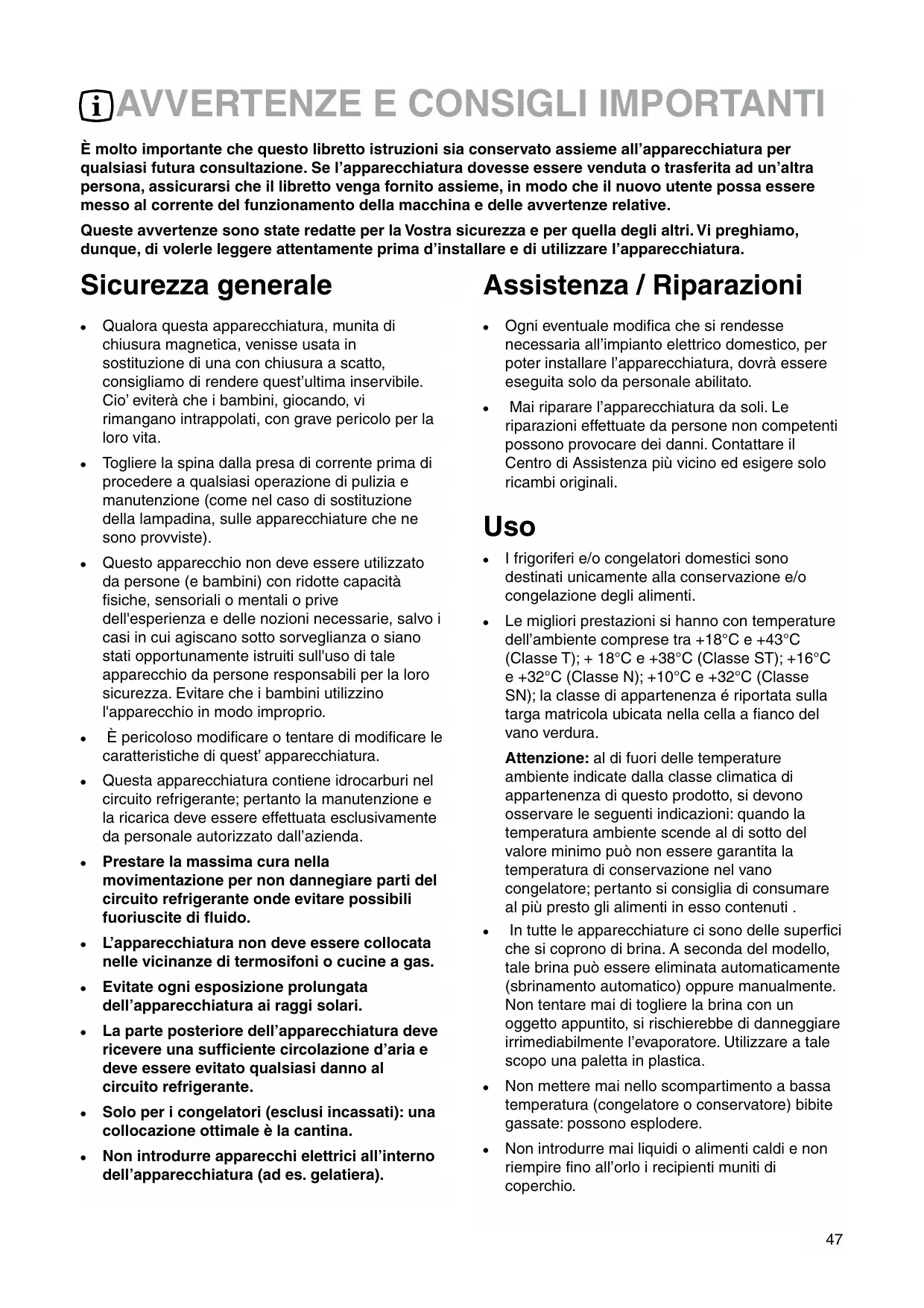 Attenzione: al di fuori delle temperature ambiente indicate alla classe climatica di apparomenza di甚么 prodotto, si devono osservare le seguentiindicazioni: quando la temperature ambiente scende al di fatto del valore minimo cui non essere garantita la temperature di conservazione nel vano congelatore; pertanto si consiglia di consumare al più presto gli alimenti inesso contenuti.