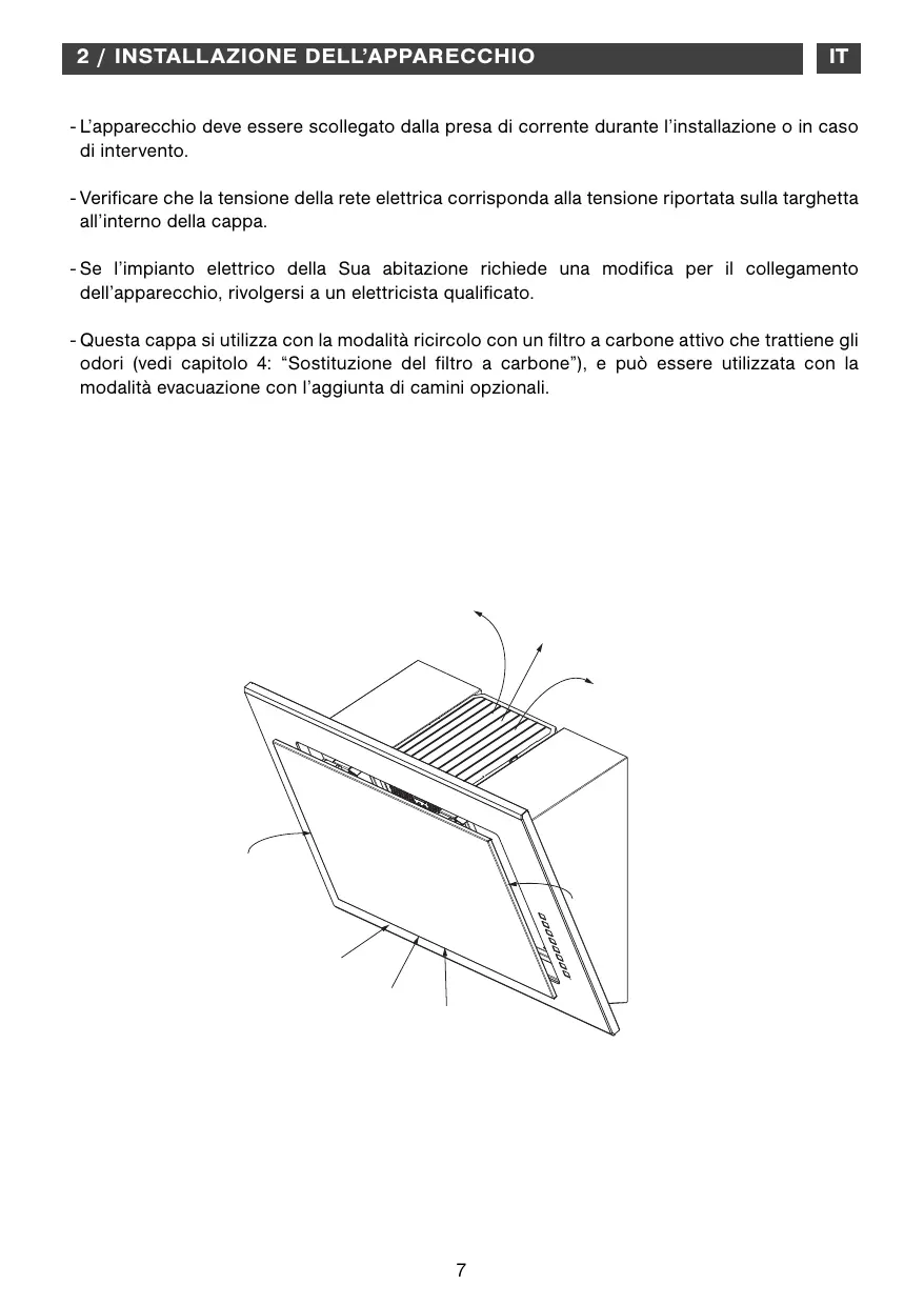 - Questa cappa si utilizza con la modalità ricircolo con unrello a carbone attivo che trattiene gli odori (vedi capitolo 4: "Sostituzione delrello a carbone"), e più essere utilizzata con la modalità evacuatione con l'aggiunta di camini opzionali.