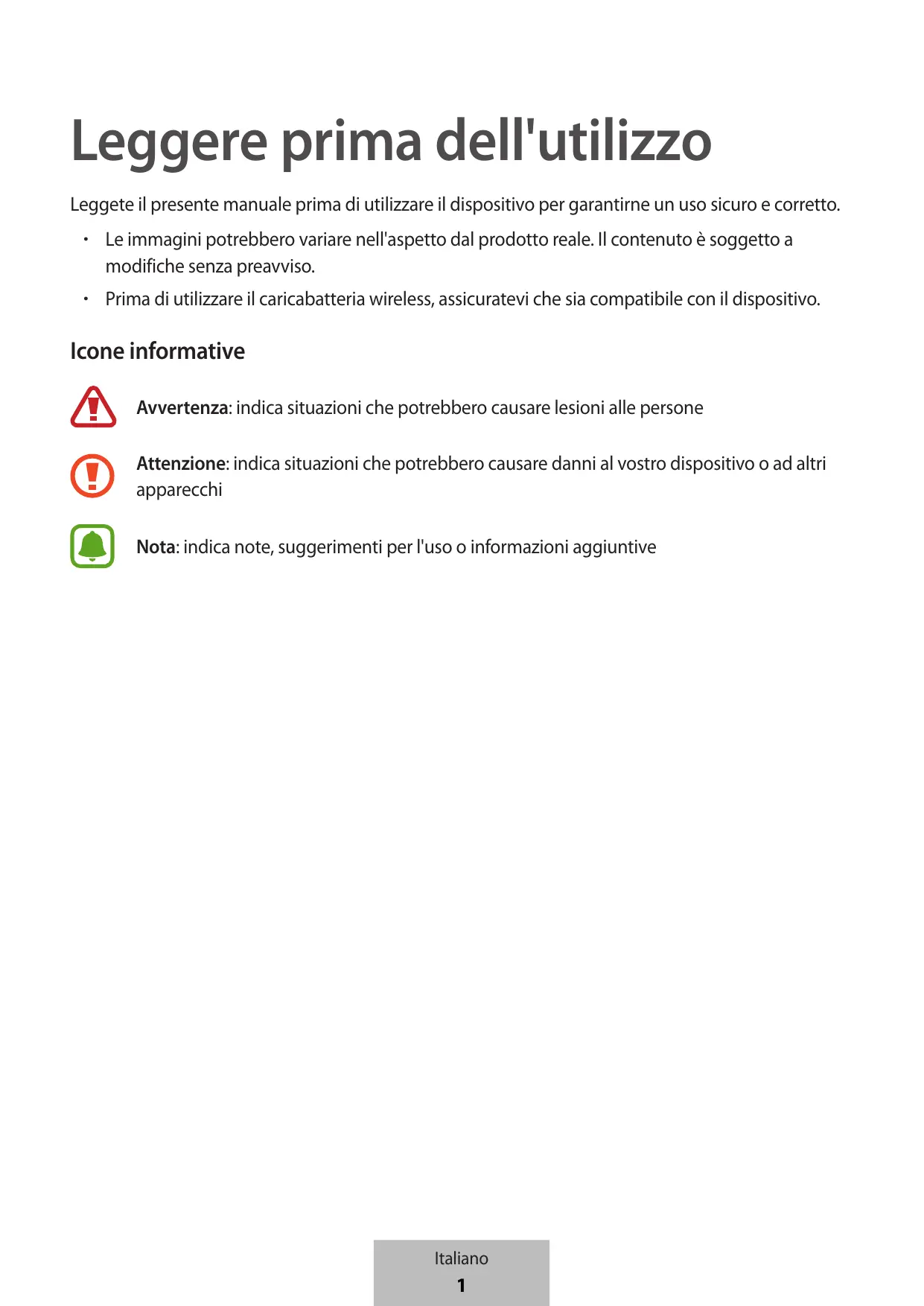- Prima di utilizzare il caricabatteria wireless, assicuratevi che sia compatibile con il dispositivo. Icone informative Avvertenza: indica situazioni che potrebbero causare lesioni alle persone Attenzione: indica situazioni che potrebbero causare danni al vostro dispositivo o ad altri apparecchi Nota: indica note, suggerimenti per l'uso o informazioni aggiuntive Italiano