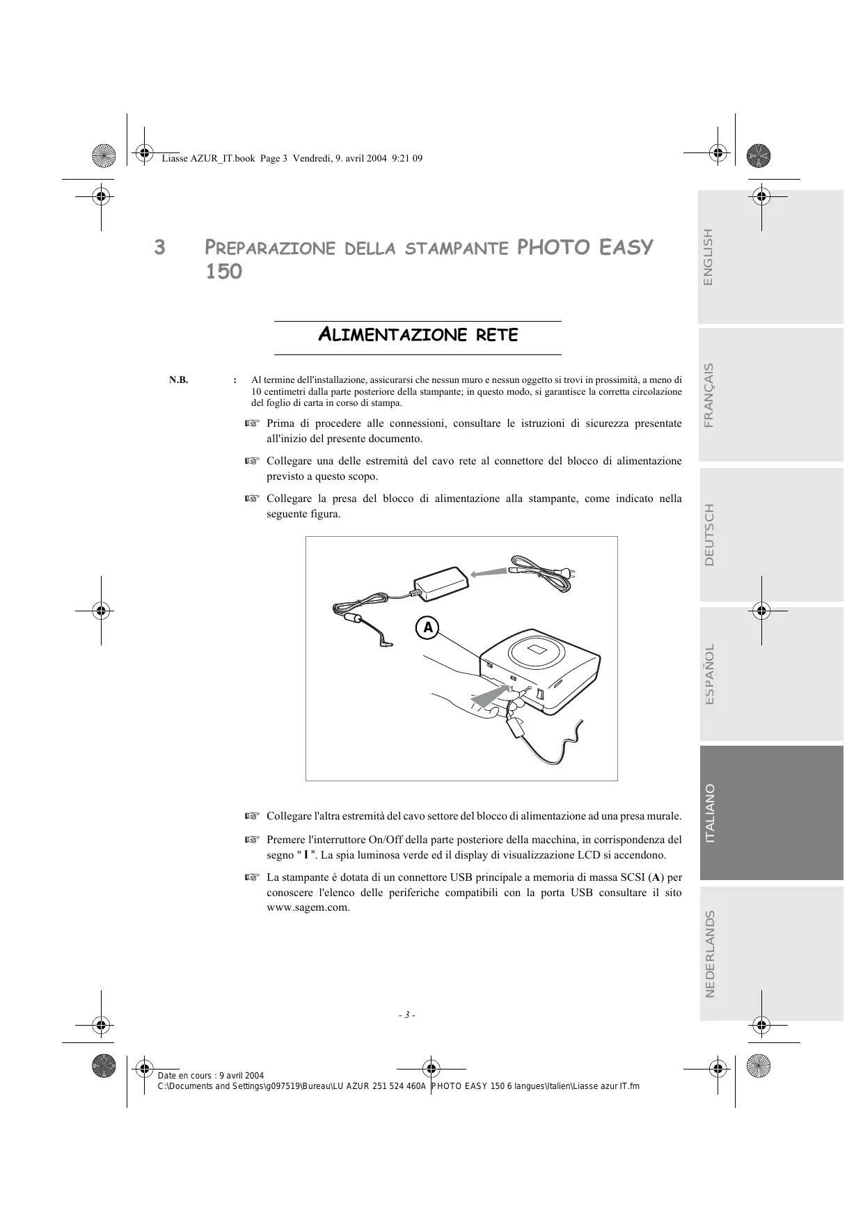 CONNESSIONE DELLA STAMPANTE ENGLISH Liasse AZUR_IT.book Page 19 Vendredi, 9. avril 2004 9:21 09