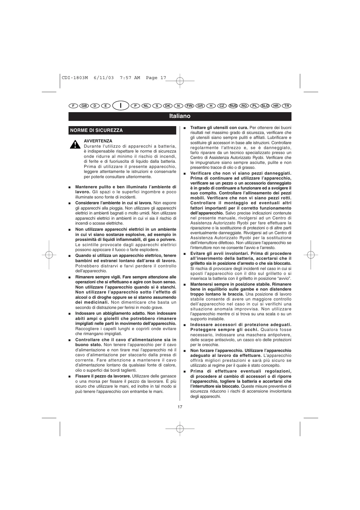 Trattare gli utensili con cura. Per ottenere dei buoni risultati nel massimo grado di sicurezza, verificare che gli utensili siano sempre puliti e affilati. Lubrificare e sostituire gli accessori in base alle istruzioni. Controllare regolarmente l'attrezzo e, se è danneggiato, farlo riparare da un tecnico specializzato presso un Centro di Assistenza Autorizzato Ryobi. Verificare che le impugnature siano sempre asciutte, pulite e non presentino tracce di olio o di grasso. Verificare che non vi siano pezzi danneggiati. Prima di continuare ad utilizzare l’apparecchio, verificare se un pezzo o un accessorio danneggiato è in grado di continuare a funzionare ed a svolgere il suo compito. Controllare l’allineamento dei pezzi mobili. Verificare che non vi siano pezzi rotti. Controllare il montaggio ed eventuali altri fattori importanti per il corretto funzionamento dell’apparecchio. Salvo precise indicazioni contenute nel presente manuale, rivolgersi ad un Centro di Assistenza Autorizzato Ryobi per fare effettuare la riparazione o la sostituzione di protezioni o di altre parti eventualmente danneggiate. Rivolgersi ad un Centro di Assistenza Autorizzato Ryobi per la sostituzione dell’interruttore difettoso. Non utilizzare l’apparecchio se l’interruttore non ne consente l’avvio e l’arresto. Evitare gli avvii involontari. Prima di procedere all’inserimento della batteria, accertarsi che il grilletto sia in posizione d’arresto o che sia bloccato. Si rischia di provocare degli incidenti nel caso in cui si sposti l’apparecchio con il dito sul grilletto o si inserisca la batteria con il grilletto in posizione “avvio”. Mantenersi sempre in posizione stabile. Rimanere bene in equilibrio sulle gambe e non distendere troppo lontano le braccia. Una posizione di lavoro stabile consente di avere un maggiore controllo dell’apparecchio nel caso in cui si verifichi una situazione anomala improvvisa. Non utilizzare l’apparecchio mentre ci si trova su una scala o su un supporto instabile. Indossare accessori di protezione adeguati. Proteggere sempre gli occhi. Qualora fosse necessario, indossare una maschera antipolvere, delle scarpe antiscivolo, un casco e/o delle protezioni per le orecchie. Non forzare l’apparecchio. Utilizzare l’apparecchio adeguato al lavoro da effettuare. L’apparecchio offrirà migliori prestazioni e sarà più sicuro se utilizzato al regime per il quale è stato concepito. Prima di effettuare eventuali regolazioni, di procedere al cambio di accessori o di riporre l’apparecchio, togliere la batteria e accertarsi che l’interruttore sia bloccato. Queste misure preventive di sicurezza riducono i rischi di accensione involontaria degli apparecchi. CDI-1803M