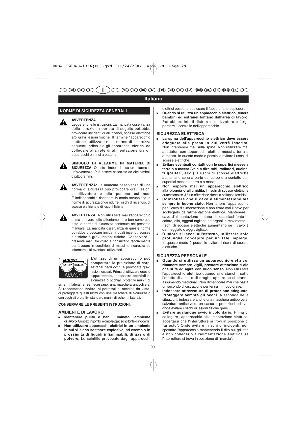 Quando si utilizza un apparecchio elettrico, rimanere sempre vigili, prestare attenzione a ciò che si fa ed agire con buon senso. Non utilizzare l'apparecchio elettrico quando si è stanchi, sotto l'effetto di alcol o di droghe oppure se si stanno assumendo medicinali. Non dimenticare mai che basta un secondo di distrazione per ferirsi in modo grave. Indossare attrezzature di protezione adeguate. Proteggere sempre gli occhi. A seconda delle situazioni, indossare anche una maschera antipolvere, calzature antiscivolo, un casco o protezioni uditive, onde evitare i rischi di lesioni fisiche gravi. Evitare qualunque avvio involontario. Prima di collegare l'apparecchio all'alimentazione elettrica, accertarsi che l'interruttore si trovi in posizione di "arresto". Onde evitare i rischi di incidenti, non spostare l'apparecchio mantenendo il dito sul grilletto e non collegarlo all'alimentazione elettrica se l'interruttore si trova in posizione di "marcia". EWS-1266EWS-1366(EU).qxd