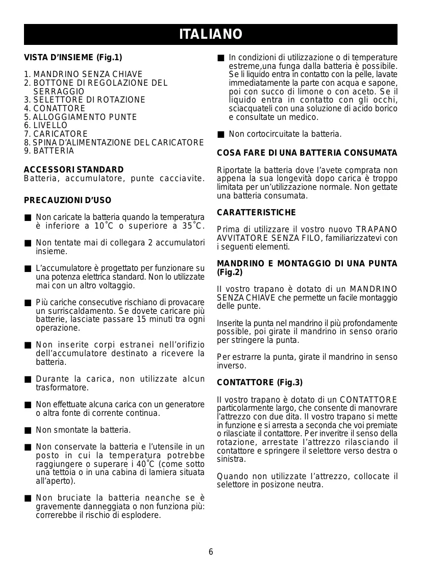 (Fig.2) ■ L’accumulatore è progettato per funzionare su una potenza elettrica standard. Non lo utilizzate mai con un altro voltaggio. II vostro trapano è dotato di un MANDRINO SENZA CHIAVE che permette un facile montaggio delle punte. ■ Più cariche consecutive rischiano di provacare un surriscaldamento. Se dovete caricare più batterie, lasciate passare 15 minuti tra ogni operazione. Inserite la punta nel mandrino il più profondamente possible, poi girate il mandrino in senso orario per stringere la punta. ■ Non inserite corpi estranei nell’orifizio dell’accumulatore destinato a ricevere la batteria. Per estrarre la punta, girate il mandrino in senso inverso. ■ Durante la carica, non utilizzate alcun trasformatore. CONTATTORE (Fig.3) II vostro trapano è dotato di un CONTATTORE particolarmente largo, che consente di manovrare l’attrezzo con due dita. II vostro trapano si mette in funzione e si arresta a seconda che voi premiate o rilasciate il contattore. Per inveritre il senso della rotazione, arrestate I’attrezzo rilasciando il contattore e springere il selettore verso destra o sinistra. ■ Non effettuate alcuna carica con un generatore o altra fonte di corrente continua. ■ Non smontate la batteria. ■ Non conservate la batteria e l’utensile in un posto in cui la temperatura potrebbe raggiungere o superare i 40˚C (come sotto una tettoia o in una cabina di lamiera situata all’aperto). Quando non utilizzate I’attrezzo, collocate il selettore in posizone neutra. ■ Non bruciate la batteria neanche se è gravemente danneggiata o non funziona più: correrebbe il rischio di esplodere.