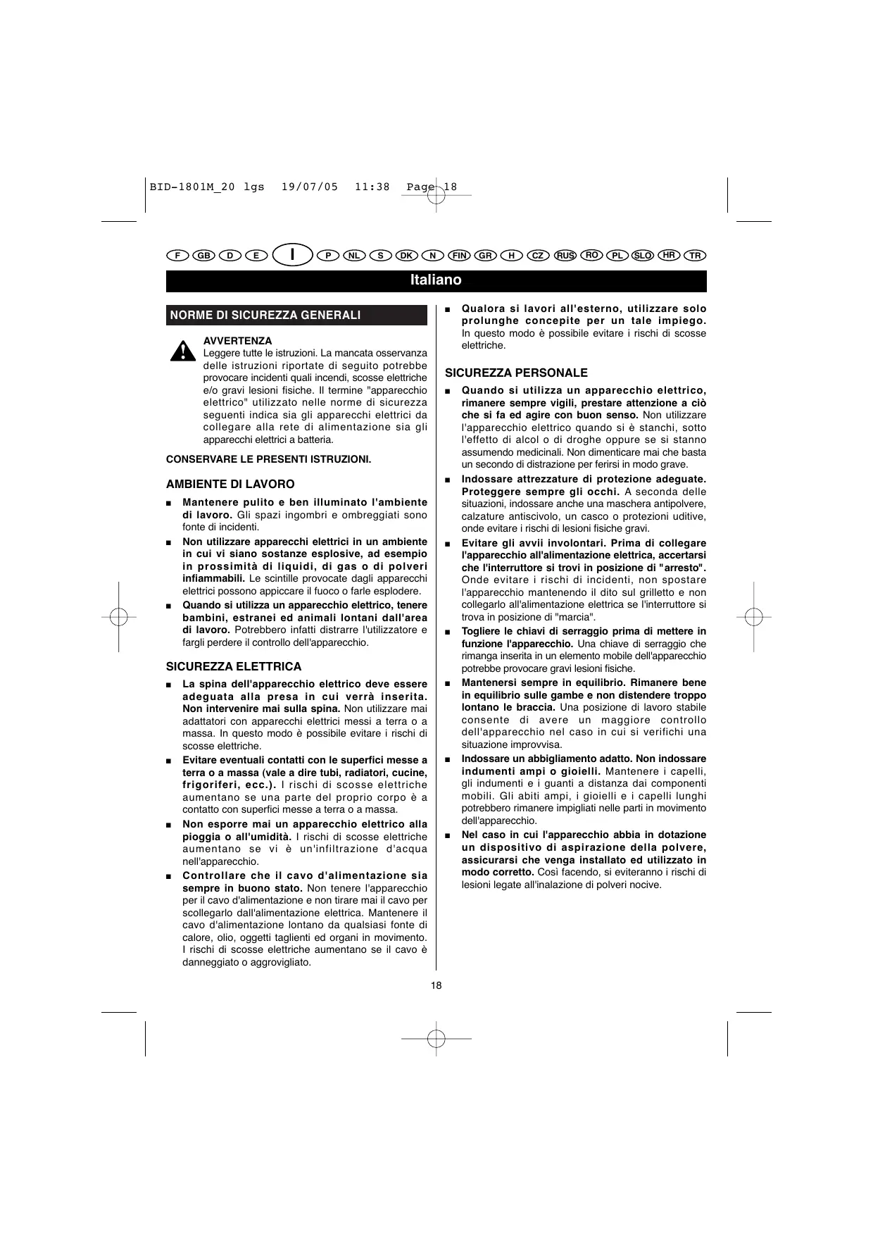 Quando si utilizza un apparecchio elettrico, rimanere sempre vigili, prestare attenzione a ciò che si fa ed agire con buon senso. Non utilizzare l'apparecchio elettrico quando si è stanchi, sotto l'effetto di alcol o di droghe oppure se si stanno assumendo medicinali. Non dimenticare mai che basta un secondo di distrazione per ferirsi in modo grave. Indossare attrezzature di protezione adeguate. Proteggere sempre gli occhi. A seconda delle situazioni, indossare anche una maschera antipolvere, calzature antiscivolo, un casco o protezioni uditive, onde evitare i rischi di lesioni fisiche gravi. Evitare gli avvii involontari. Prima di collegare l'apparecchio all'alimentazione elettrica, accertarsi che l'interruttore si trovi in posizione di "arresto". Onde evitare i rischi di incidenti, non spostare l'apparecchio mantenendo il dito sul grilletto e non collegarlo all'alimentazione elettrica se l'interruttore si trova in posizione di "marcia". Togliere le chiavi di serraggio prima di mettere in funzione l'apparecchio. Una chiave di serraggio che rimanga inserita in un elemento mobile dell'apparecchio potrebbe provocare gravi lesioni fisiche. Mantenersi sempre in equilibrio. Rimanere bene in equilibrio sulle gambe e non distendere troppo lontano le braccia. Una posizione di lavoro stabile consente di avere un maggiore controllo dell'apparecchio nel caso in cui si verifichi una situazione improvvisa. Indossare un abbigliamento adatto. Non indossare indumenti ampi o gioielli. Mantenere i capelli, gli indumenti e i guanti a distanza dai componenti mobili. Gli abiti ampi, i gioielli e i capelli lunghi potrebbero rimanere impigliati nelle parti in movimento dell'apparecchio. Nel caso in cui l'apparecchio abbia in dotazione un dispositivo di aspirazione della polvere, assicurarsi che venga installato ed utilizzato in modo corretto. Così facendo, si eviteranno i rischi di lesioni legate all'inalazione di polveri nocive. BID-1801M_20 lgs