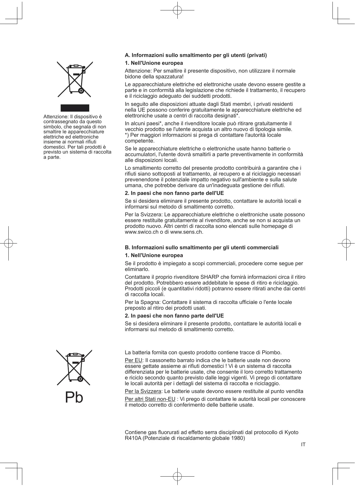 A. Informazioni sullo smaltimento per gli utenti (privati) 1. Nell'Unione europea Attenzione: Per smaltire il presente dispositivo, non utilizzare il normale bidone della spazzatura! Le apparecchiature elettriche ed elettroniche usate devono essere gestite a parte e in conformità alla legislazione che richiede il trattamento, il recupero e il riciclaggio adeguato dei suddetti prodotti. In seguito alle disposizioni attuate dagli Stati membri, i privati residenti nella UE possono conferire gratuitamente le apparecchiature elettriche ed elettroniche usate a centri di raccolta designati*. In alcuni paesi*, anche il rivenditore locale può ritirare gratuitamente il vecchio prodotto se l'utente acquista un altro nuovo di tipologia simile. *) Per maggiori informazioni si prega di contattare l'autorità locale competente. Se le apparecchiature elettriche o elettroniche usate hanno batterie o accumulatori, l'utente dovrà smaltirli a parte preventivamente in conformità alle disposizioni locali. Lo smaltimento corretto del presente prodotto contribuirà a garantire che i rifiuti siano sottoposti al trattamento, al recupero e al riciclaggio necessari prevenendone il potenziale impatto negativo sull'ambiente e sulla salute umana, che potrebbe derivare da un'inadeguata gestione dei rifiuti. 2. In paesi che non fanno parte dell'UE Se si desidera eliminare il presente prodotto, contattare le autorità locali e informarsi sul metodo di smaltimento corretto. Per la Svizzera: Le apparecchiature elettriche o elettroniche usate possono essere restituite gratuitamente al rivenditore, anche se non si acquista un prodotto nuovo. Altri centri di raccolta sono elencati sulle homepage di www.swico.ch o di www.sens.ch. B. Informazioni sullo smaltimento per gli utenti commerciali 1. Nell'Unione europea Se il prodotto è impiegato a scopi commerciali, procedere come segue per eliminarlo. Contattare il proprio rivenditore SHARP che fornirà informazioni circa il ritiro del prodotto. Potrebbero essere addebitate le spese di ritiro e riciclaggio. Prodotti piccoli (e quantitativi ridotti) potranno essere ritirati anche dai centri di raccolta locali. Per la Spagna: Contattare il sistema di raccolta ufficiale o l'ente locale preposto al ritiro dei prodotti usati. 2. In paesi che non fanno parte dell'UE Se si desidera eliminare il presente prodotto, contattare le autorità locali e informarsi sul metodo di smaltimento corretto.