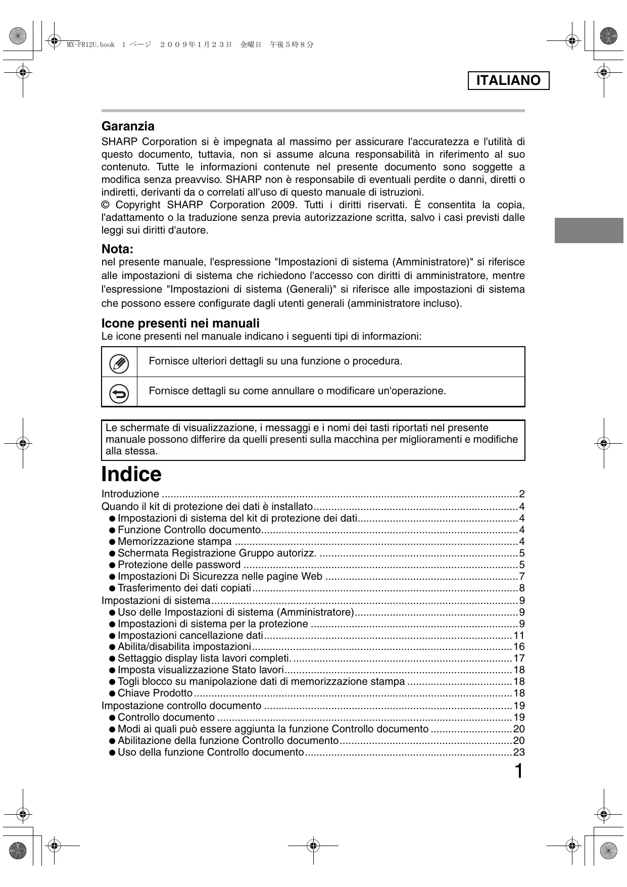 - ITALIANO Garanzia SHARP Corporation si è impegnata al massimo per assicurare l'accuratezza e l'utilità di questo documento, tuttavia, non si assume alcuna responsabilità in riferimento al suo contenuto. Tutte le informazioni contenute nel presente documento sono soggette a modifica senza preavviso. SHARP non è responsabile di eventuali perdite o danni, diretti o indiretti, derivanti da o correlati all'uso di questo manuale di istruzioni. © Copyright SHARP Corporation 2009. Tutti i diritti riservati. È consentita la copia, l'adattamento o la traduzione senza previa autorizzazione scritta, salvo i casi previsti dalle leggi sui diritti d'autore. Nota: nel presente manuale, l'espressione "Impostazioni di sistema (Amministratore)" si riferisce alle impostazioni di sistema che richiedono l'accesso con diritti di amministratore, mentre l'espressione "Impostazioni di sistema (Generali)" si riferisce alle impostazioni di sistema che possono essere configurate dagli utenti generali (amministratore incluso). Icone presenti nei manuali Le icone presenti nel manuale indicano i seguenti tipi di informazioni: Fornisce ulteriori dettagli su una funzione o procedura. Fornisce dettagli su come annullare o modificare un'operazione. Le schermate di visualizzazione, i messaggi e i nomi dei tasti riportati nel presente manuale possono differire da quelli presenti sulla macchina per miglioramenti e modifiche alla stessa. Indice Introduzione p. 2