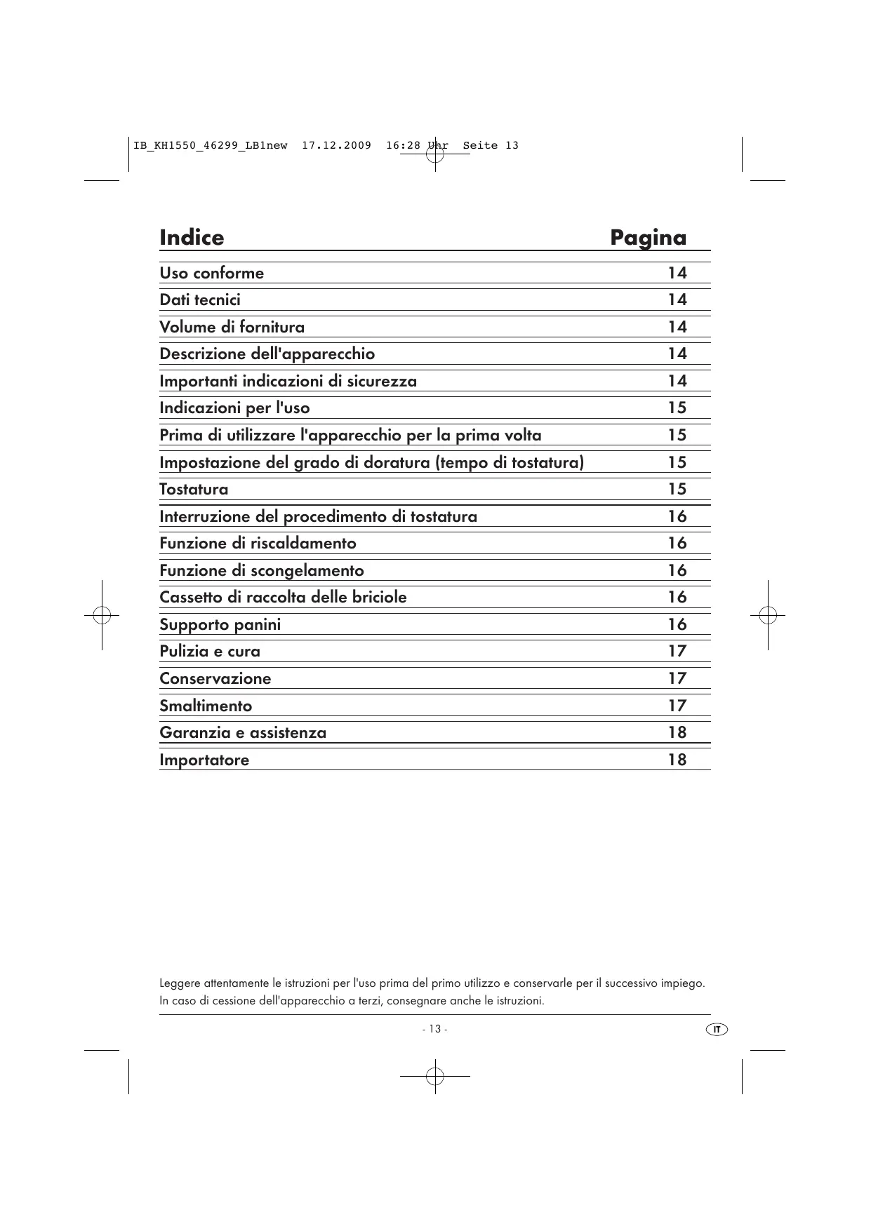 16:28 Uhr Tostapane a due fessure lunghe KH 1550 Importanti indicazioni di sicurezza Per evitare il pericolo di morte per scossa elettrica: Uso conforme Il presente apparecchio è previsto per la tostatura di fette di pane, panini e toast per uso domestico. Esso non è idoneo all'impiego con altri alimenti o altri materiali, né per l'impiego in ambienti commerciali e industriali. Qualunque altro impiego o modifica dell'apparecchio è da considerarsi non conforme alla destinazione e comporta gravi rischi di infortunio. Dati tecnici Tensione nominale: Tensione nominale: Seite 14
