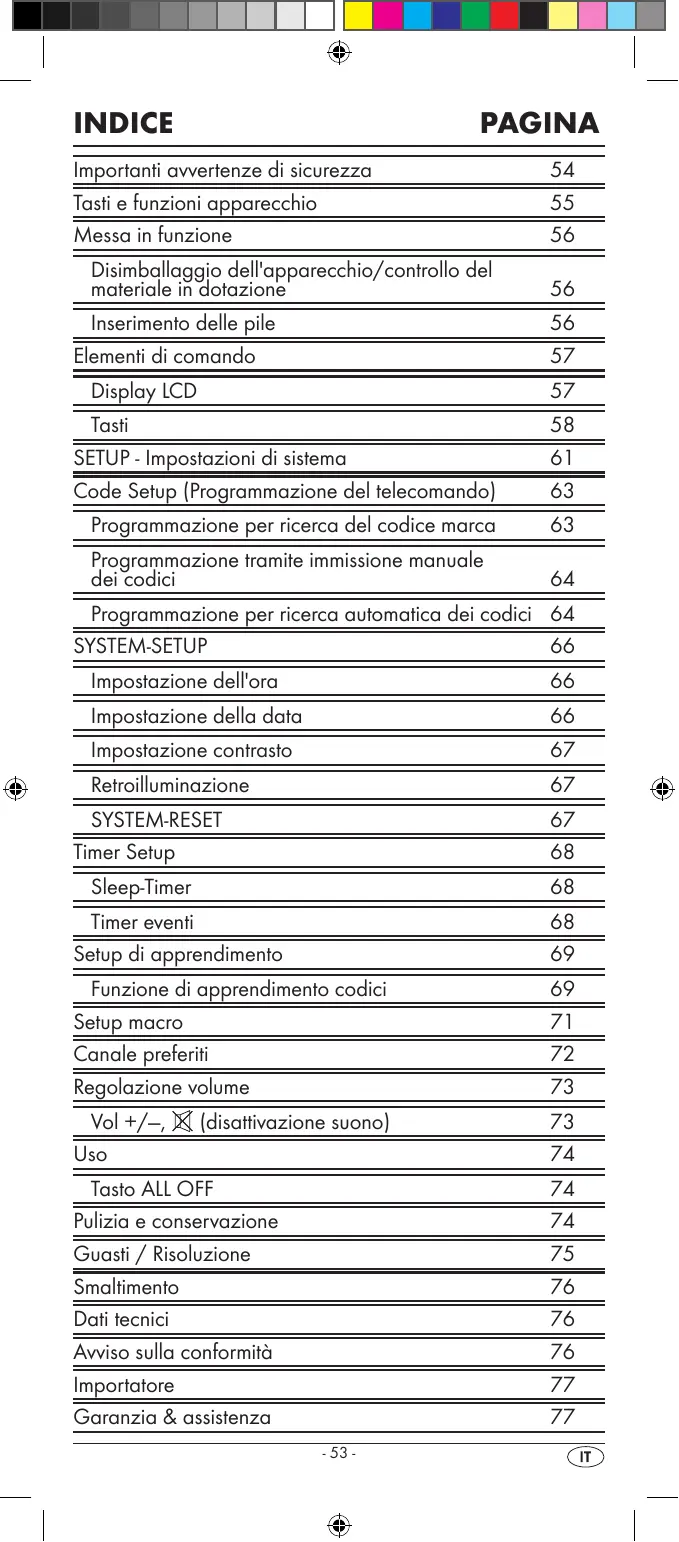 Guasti / Risoluzione L'apparecchio non reagisce al telecomando universale. >> Controllare le pile. È necessaria una tensione sufficiente e il corretto inserimento delle pile. >> Si è premuto il tasto apparecchi e corretto per l'apparecchio di destinazione desiderato? >> Controllare che sia stato programmato il codice corretto per l'apparecchio di destinazione (v. paragrafo „Code Setup“). Il telecomando universale non trasmette correttamente i comandi. >> Premere il relativo tasto apparecchi e per portare il telecomando nella modalità corretta. >> È necessaria una tensione sufficiente e il corretto inserimento delle pile. >> Probabilmente si sta utilizzando un codice errato. Avviare la ricerca dei codici delle marche, la ricerca automatica dei codici o l'immissione diretta del codice (manuale). Il telecomando universale non cambia l'emittente sull'apparecchio. >> Premere il relativo tasto apparecchi e per portare il telecomando nella modalità corretta. >> Se il telecomando originale non possiede tasti „-/- -“, cambiare i programmi con i tasti CH+/— u o con i tasti numerici o. >> Se anche tale opzione non funzionasse, controllare che non sia attivata la protezione bambini per l'apparecchio di destinazione. Alcuni tasti del telecomando universale non funzionano correttamente. >> Il telecomando universale probabilmente non possiede tutte le funzioni del telecomando originale dell'apparecchio. >> Probabilmente non è stato programmato il codice ottimale. Cercare un codice che supporti maggiori funzioni dell'apparecchio di destinazione. Il telecomando universale non reagisce più a seguito della pressione di un tasto. >> È necessaria una tensione sufficiente e il corretto inserimento delle pile. >> Dirigere il telecomando universale verso l'apparecchio. Il display LCD q non mostra alcun messaggio. >> È necessaria una tensione sufficiente e il corretto inserimento delle pile. >> Il contrasto potrebbe essere troppo ridotto. Aumentare il contrasto.
