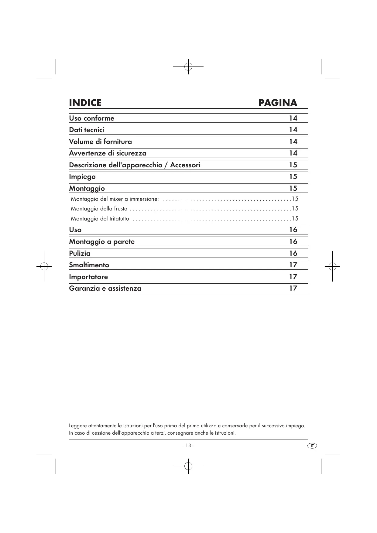 - In caso di malfunzionamenti o prima di pulire il set di mixer a immersione, disinserire la spina dalla presa di rete. Non immergere mai il blocco motore del set di mixer a immersione in liquidi e impedire la penetrazione di liquidi nell'alloggiamento del blocco motore. Dati tecnici Tensione di rete: 220 240 V ~ / 50 Hz Tensione nominale: 300 W Classe di protezione: Funzionamento continuato: 1 minuto Tempo di funzionamento abbreviato. Il tempo di funzionamento abbreviato indica il tempo di funzio namento dell'apparecchio senza pericolo di surriscal damento e di guasti al motore. Lasciare raffreddare l'apparecchio 2 minuti prima di riavviarlo. Capacità Misurino: Quantità massima di liquidi da inserire nell'apparecchio: Volume di fornitura Mixer a immersione con blocco motore Misurino con coperchio/base Frusta Tritatutto (lama e ciotola con coperchio/ base combinati) Supporto a parete 2 tasselli 2 viti Istruzioni per l'uso 700 ml 300 ml