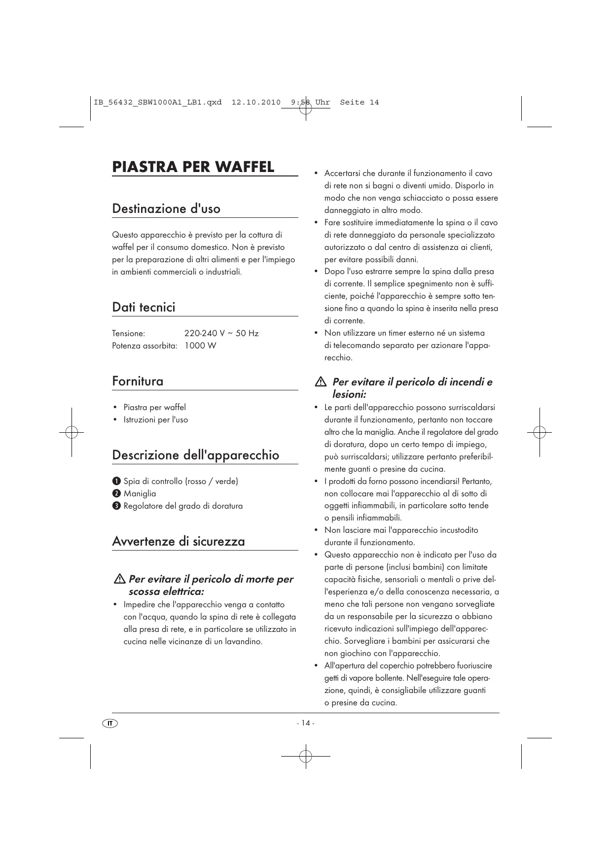 Per evitare il pericolo di incendi e lesioni: • Le parti dell'apparecchio possono surriscaldarsi durante il funzionamento, pertanto non toccare altro che la maniglia. Anche il regolatore del grado di doratura, dopo un certo tempo di impiego, può surriscaldarsi; utilizzare pertanto preferibilmente guanti o presine da cucina. • I prodotti da forno possono incendiarsi! Pertanto, non collocare mai l'apparecchio al di sotto di oggetti infiammabili, in particolare sotto tende o pensili infiammabili. • Non lasciare mai l'apparecchio incustodito durante il funzionamento. • Questo apparecchio non è indicato per l'uso da parte di persone (inclusi bambini) con limitate capacità fisiche, sensoriali o mentali o prive dell'esperienza e/o della conoscenza necessaria, a meno che tali persone non vengano sorvegliate da un responsabile per la sicurezza o abbiano ricevuto indicazioni sull'impiego dell'apparecchio. Sorvegliare i bambini per assicurarsi che non giochino con l'apparecchio. • All'apertura del coperchio potrebbero fuoriuscire getti di vapore bollente. Nell'eseguire tale operazione, quindi, è consigliabile utilizzare guanti o presine da cucina. - 14 -