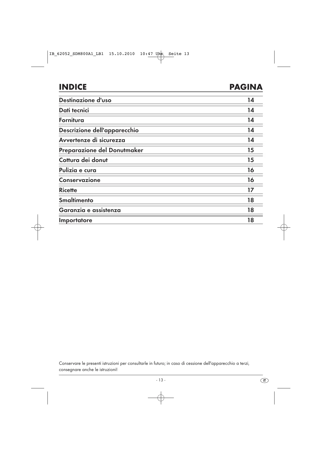 Conservare le presenti istruzioni per consultarle in futuro; in caso di cessione dell'apparecchio a terzi, consegnare anche le istruzioni! - 13 -