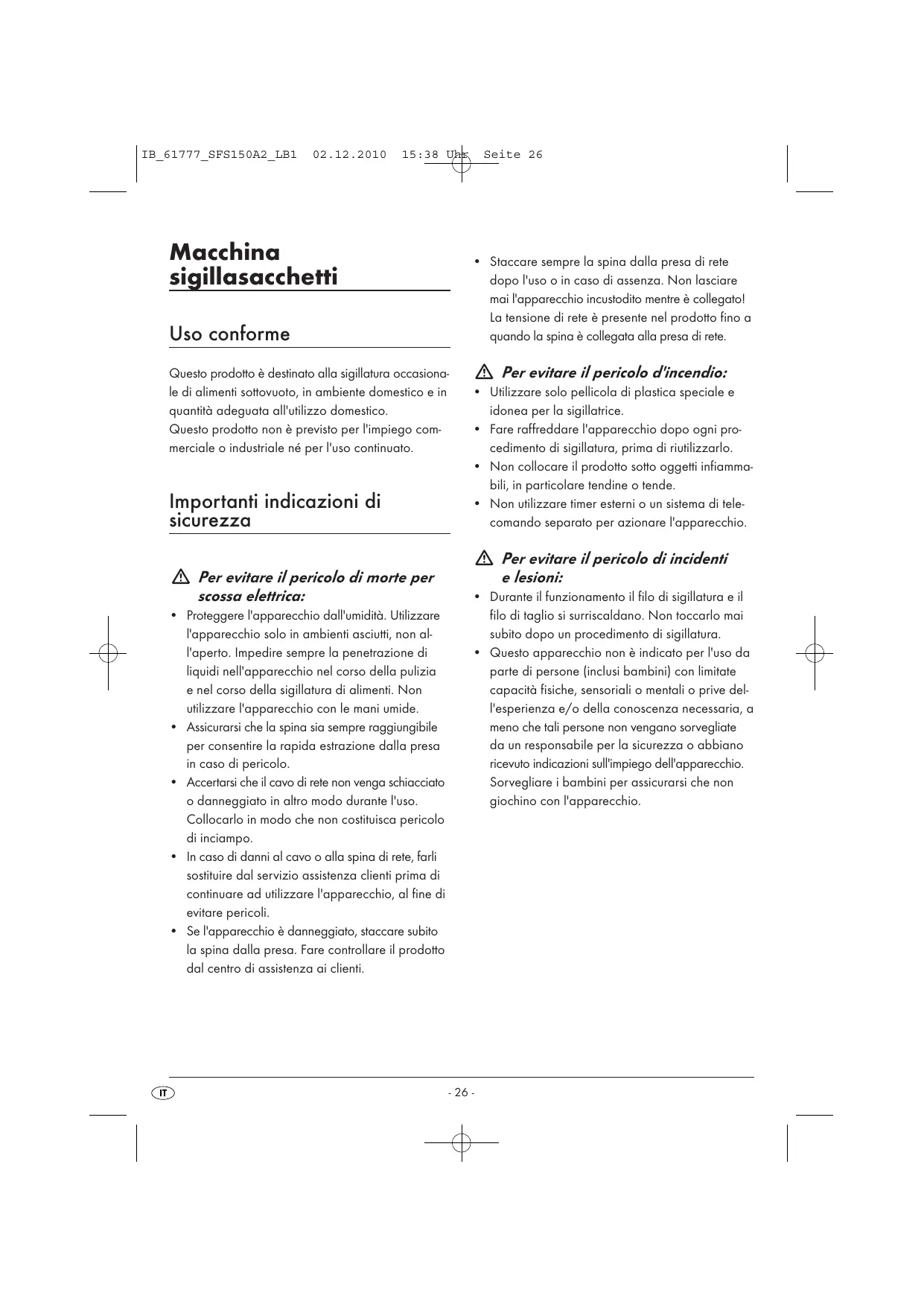 Per evitare il pericolo di incidenti e lesioni: • Durante il funzionamento il filo di sigillatura e il filo di taglio si surriscaldano. Non toccarlo mai subito dopo un procedimento di sigillatura. • Questo apparecchio non è indicato per l'uso da parte di persone (inclusi bambini) con limitate capacità fisiche, sensoriali o mentali o prive dell'esperienza e/o della conoscenza necessaria, a meno che tali persone non vengano sorvegliate da un responsabile per la sicurezza o abbiano ricevuto indicazioni sull'impiego dell'apparecchio. Sorvegliare i bambini per assicurarsi che non giochino con l'apparecchio.