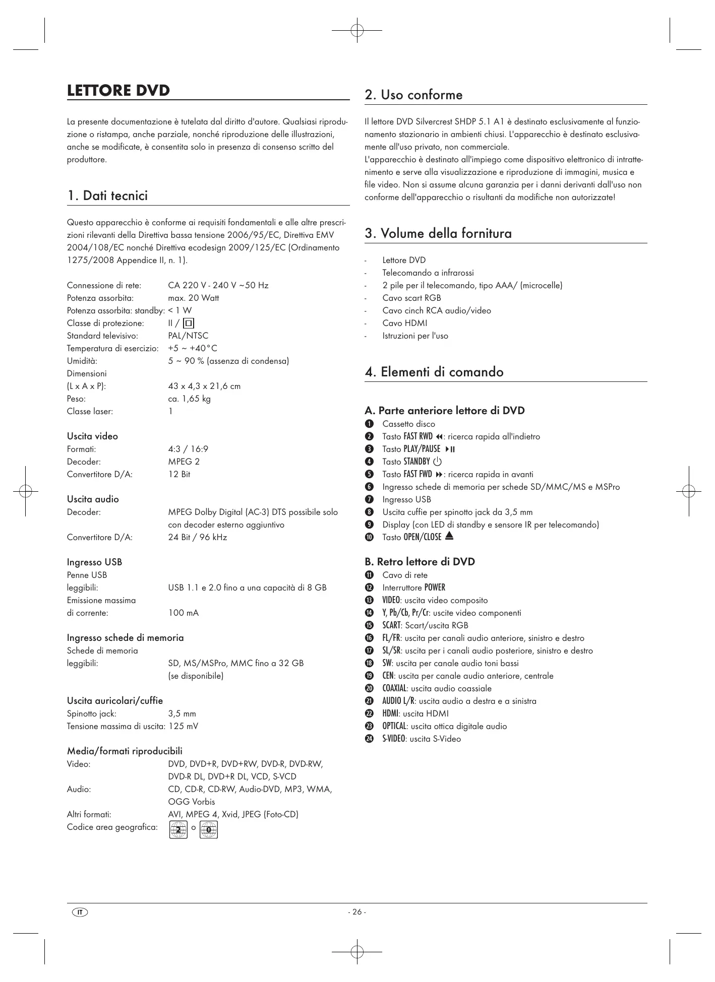1. Dati tecnici 26 2. Uso conforme 26 3. Volume della fornitura 26 4. Elementi di comando 26 5. Installazione del lettore DVD 27 6. Avvertenze di sicurezza 27