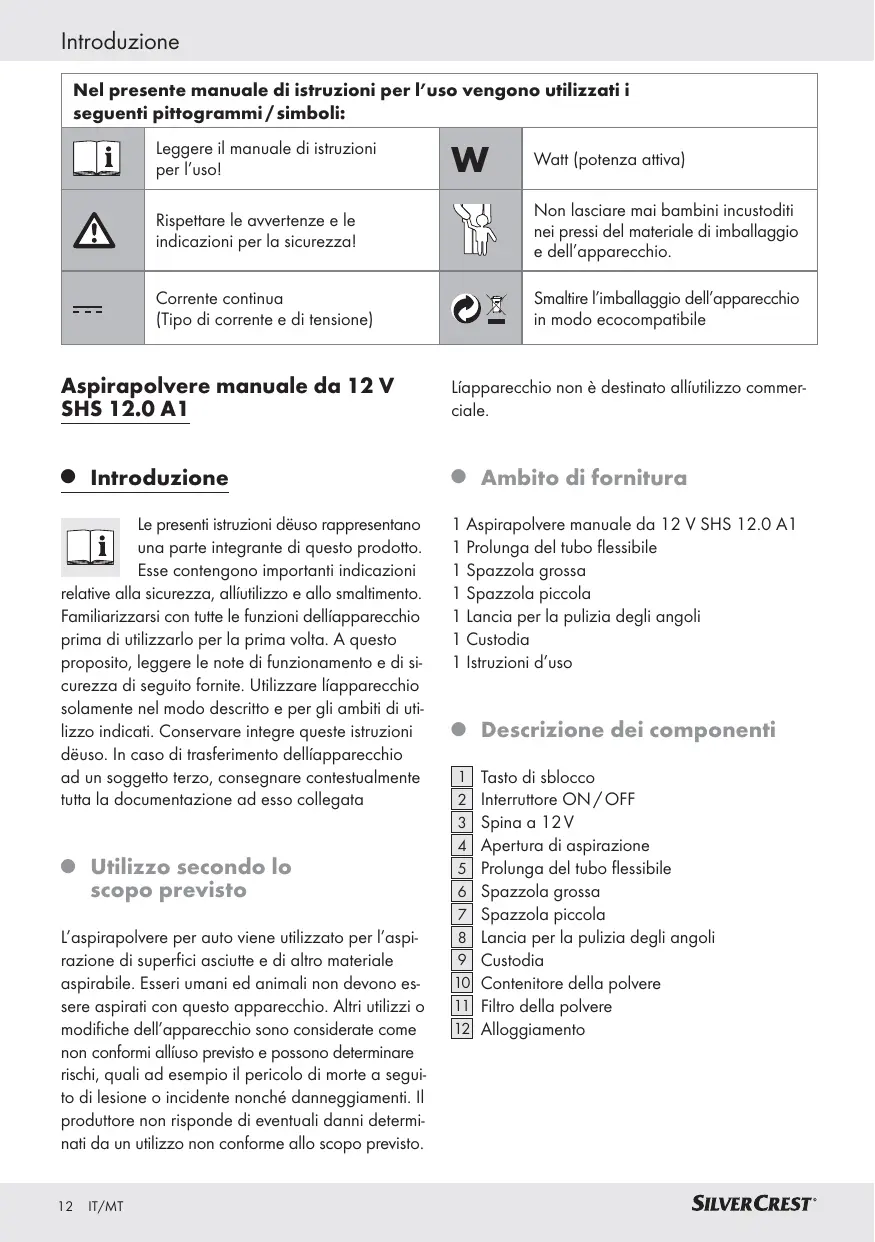Scarica le istruzioni per il tuo Aspirapolvere portatile in formato PDF gratuitamente! Trova il tuo manuale SHS 12.0 A1 12V HAND-HELD VACUUM CLEANER - SILVERCREST e riprendi in mano il tuo dispositivo elettronico. In questa pagina sono pubblicati tutti i documenti necessari per l'utilizzo del tuo dispositivo. SHS 12.0 A1 12V HAND-HELD VACUUM CLEANER del marchio SILVERCREST.