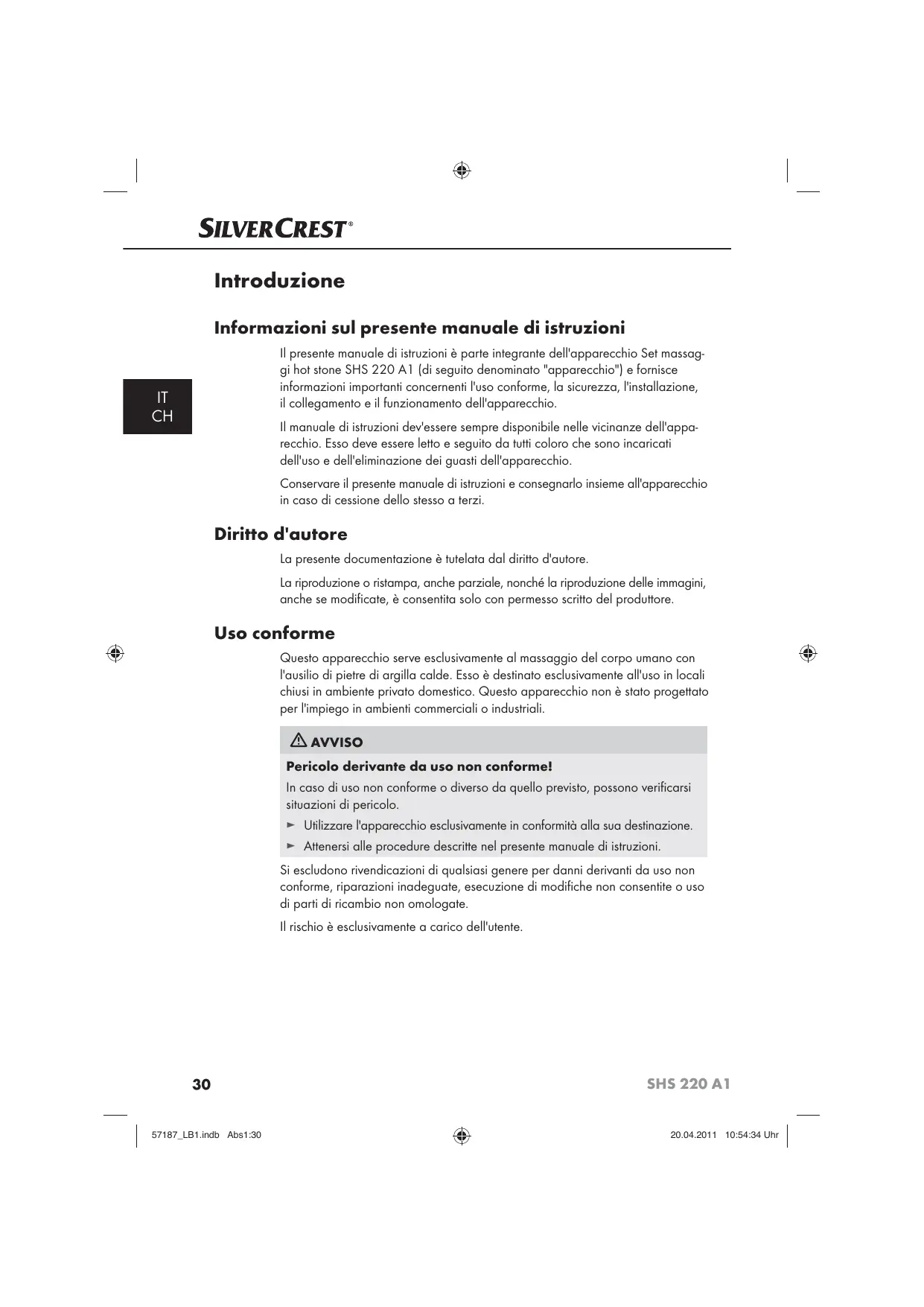 Introduzione Informazioni sul presente manuale di istruzioni Il presente manuale di istruzioni è parte integrante dell'apparecchio Set massaggi hot stone SHS 220 A1 (di seguito denominato "apparecchio") e fornisce informazioni importanti concernenti l'uso conforme, la sicurezza, l'installazione, il collegamento e il funzionamento dell'apparecchio.