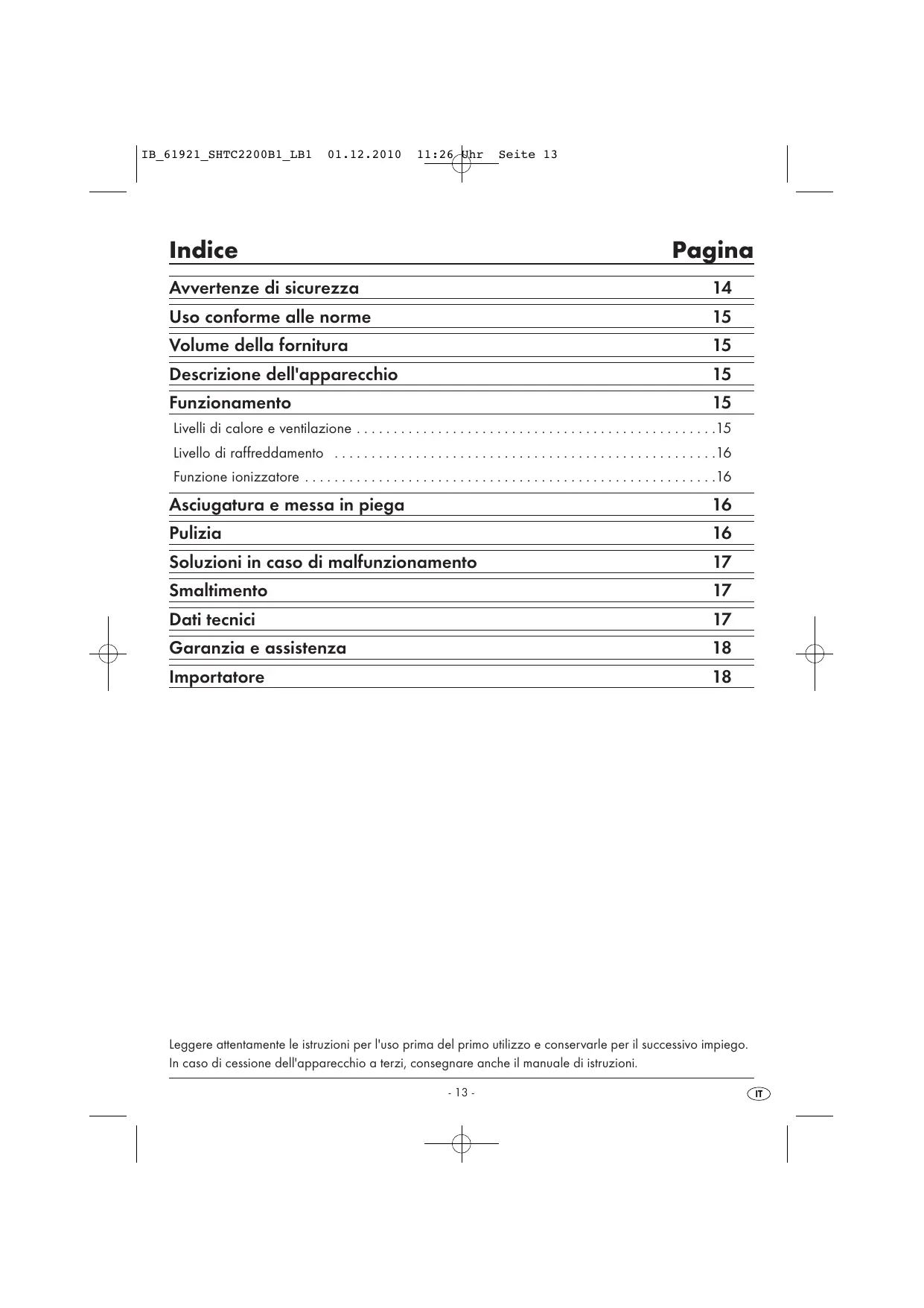 MANUALE UTENTE SHTC 2200 B1 IONIC HAIRDRYER SILVERCREST