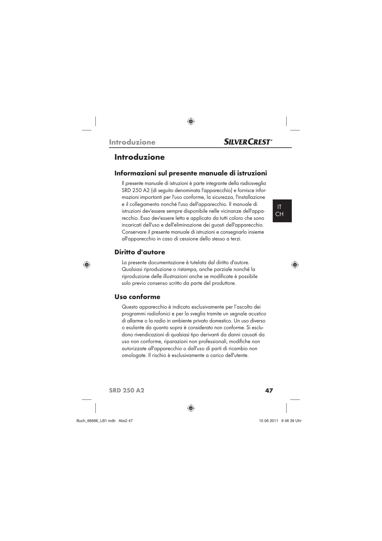 Buch_66666_LB1 indb Abs2 46 SRD 250 A2 15 06 2011 9 46 39 Uhr Introduzione Introduzione Informazioni sul presente manuale di istruzioni Il presente manuale di istruzioni è parte integrante della radiosveglia SRD 250 A2 (di seguito denominata l'apparecchio) e fornisce informazioni importanti per l'uso conforme, la sicurezza, l'installazione e il collegamento nonché l'uso dell'apparecchio. Il manuale di istruzioni dev'essere sempre disponibile nelle vicinanze dell'apparecchio. Esso dev'essere letto e applicato da tutti coloro che sono incaricati dell'uso e dell'eliminazione dei guasti dell'apparecchio. Conservare il presente manuale di istruzioni e consegnarlo insieme all'apparecchio in caso di cessione dello stesso a terzi.