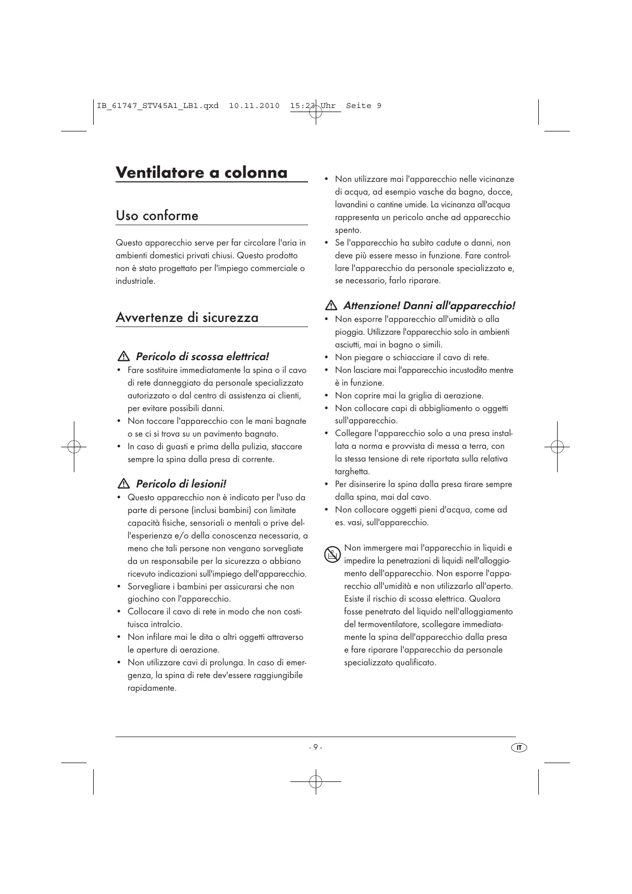 - Se l'apparecchio ha subìto cadute o danni, non deve più essere messo in funzione. Fare controllare l'apparecchio da personale specializzato e, se necessario, farlo riparare. Uso conforme Questo apparecchio serve per far circolare l'aria in ambienti domestici privati chiusi. Questo prodotto non è stato progettato per l'impiego commerciale o industriale. Attenzione! Danni all'apparecchio! Avvertenze di sicurezza