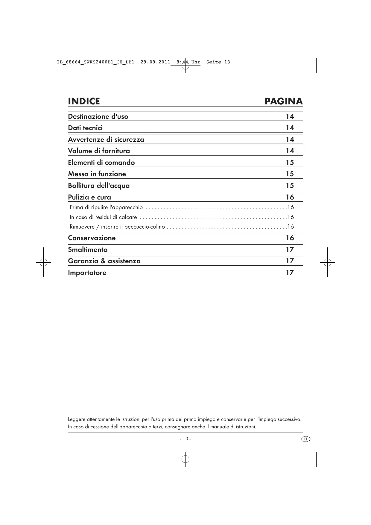 Leggere attentamente le istruzioni per l'uso prima del primo impiego e conservarle per l'impiego successivo. In caso di cessione dell'apparecchio a terzi, consegnare anche il manuale di istruzioni. - 13 -
