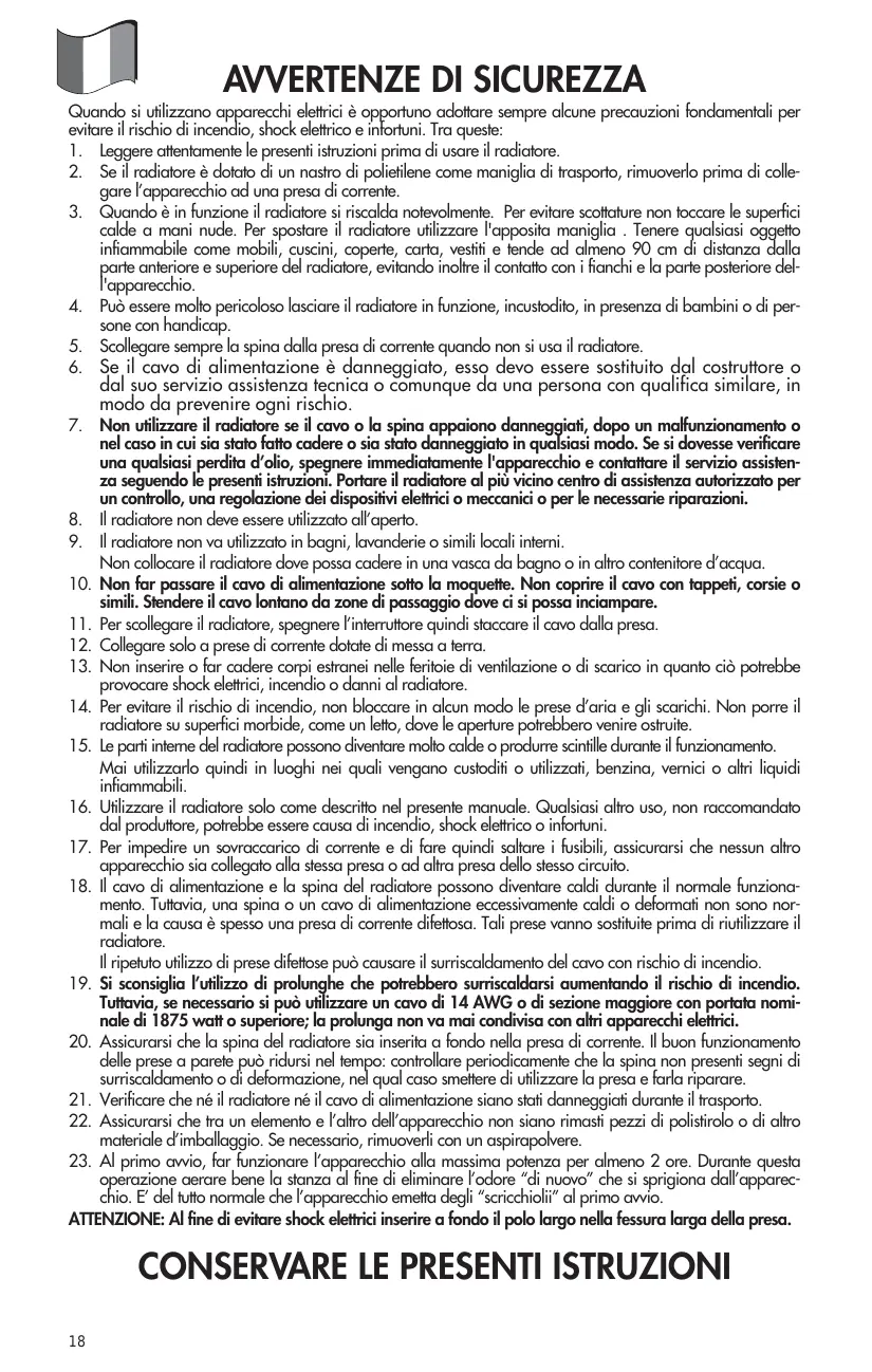 16. Utilizzare il radiatore solo come descritto nel presente manuale. Qualsiasi altro uso, non raccomandato