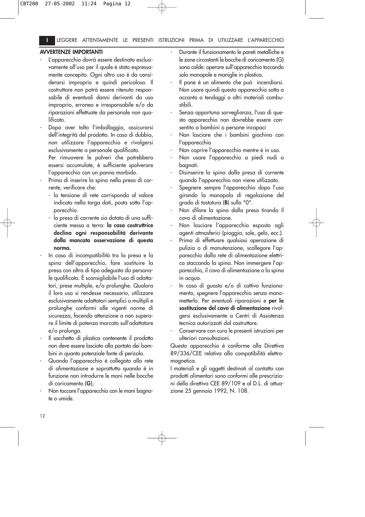 Durante il funzionamento le pareti metalliche e le zone circostanti le bocche di caricamento (G) sono caldle: operare sull'apparecchio toccando solo manopole e maniglie in plastic. Il pane à un alimento che puè incendiarsi. Non usare quindi questo apparecchio sotto o accanto a tendaggi o altri materiali combu- stibili. Senza opportuna sorveglianza, l'uso di que- sto apparecchio non dovrebbe essere con sentito a bambini o persone incapaci Non lasciare che i bambini giochino con l'apparecchio Non coprire l'apparecchio mentre à in uso. Non usare l'apparecchio a piedi nudi o bagnati. Disinserire la spina dalla presa di corrente quando l'apparecchio non viene utilizzato. Spegnere sempre lapparecchio dopo l'uso girando la manopola di regolazione del grado di tostatura (B) sullo "O". Non sfilare la spina dalla presa tirando il cavo di alimentazione. Non lasciare l'apparecchio esposto agli agenti atmosferici (pioggia, sole, gelo, ecc.]. Prima di effetuare qualsiasi operazione di pulizia o di manutenzione, scollegare l'ap- parecchio dalla rete di alimentazione elettri- ca staccando la spina. Non immergere l'ap- parecchio, il cavo di alimentazione o la spina in acqua. In caso di guasto e/o di caïtivo funziona- mento, spegnere l'apparecchio senza mano- metterlo. Per eventuali riparazioni e per la sostituzione del cavo di alimentazione rivol- gersi esclusivamente a Centri di Assistenza tecnica autorizzati dal costruttore. Conservare con cura le presenti istruzioni per ulteriori consultazioni. Questo apparecchio à conforme alla Direttiva 89/336/CEE relativa alla compatibilità elettro- magnetica. 1 materiali e gli oggetti destinati al contatto con prodotti alimentari sono conformi alle prescrizio- ni della diretiva CEE 89/109 e al D.L. di attua- zione 25 gennaio 1992, N. 108.