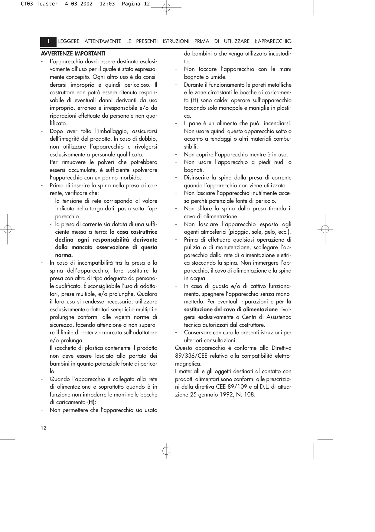 UTILIZZARE L’APPARECCHIO da bambini o che venga utilizzato incustodito. - Non toccare l’apparecchio con le mani bagnate o umide. - Durante il funzionamento le pareti metalliche e le zone circostanti le bocche di caricamento (H) sono calde: operare sull’apparecchio toccando solo manopole e maniglie in plastica. - Il pane è un alimento che può incendiarsi. Non usare quindi questo apparecchio sotto o accanto a tendaggi o altri materiali combustibili. - Non coprire l’apparecchio mentre è in uso. - Non usare l’apparecchio a piedi nudi o bagnati. - Disinserire la spina dalla presa di corrente quando l’apparecchio non viene utilizzato. - Non lasciare l’apparecchio inutilmente acceso perché potenziale fonte di pericolo. - Non sfilare la spina dalla presa tirando il cavo di alimentazione. - Non lasciare l’apparecchio esposto agli agenti atmosferici (pioggia, sole, gelo, ecc.). - Prima di effettuare qualsiasi operazione di pulizia o di manutenzione, scollegare l’apparecchio dalla rete di alimentazione elettrica staccando la spina. Non immergere l’apparecchio, il cavo di alimentazione o la spina in acqua. - In caso di guasto e/o di cattivo funzionamento, spegnere l’apparecchio senza manometterlo. Per eventuali riparazioni e per la sostituzione del cavo di alimentazione rivolgersi esclusivamente a Centri di Assistenza tecnica autorizzati dal costruttore. - Conservare con cura le presenti istruzioni per ulteriori consultazioni. Questo apparecchio è conforme alla Direttiva 89/336/CEE relativa alla compatibilità elettromagnetica. I materiali e gli oggetti destinati al contatto con prodotti alimentari sono conformi alle prescrizioni della direttiva CEE 89/109 e al D.L. di attuazione 25 gennaio 1992, N. 108. CT03 Toaster 4-03-2002 12:03 Pagina 13