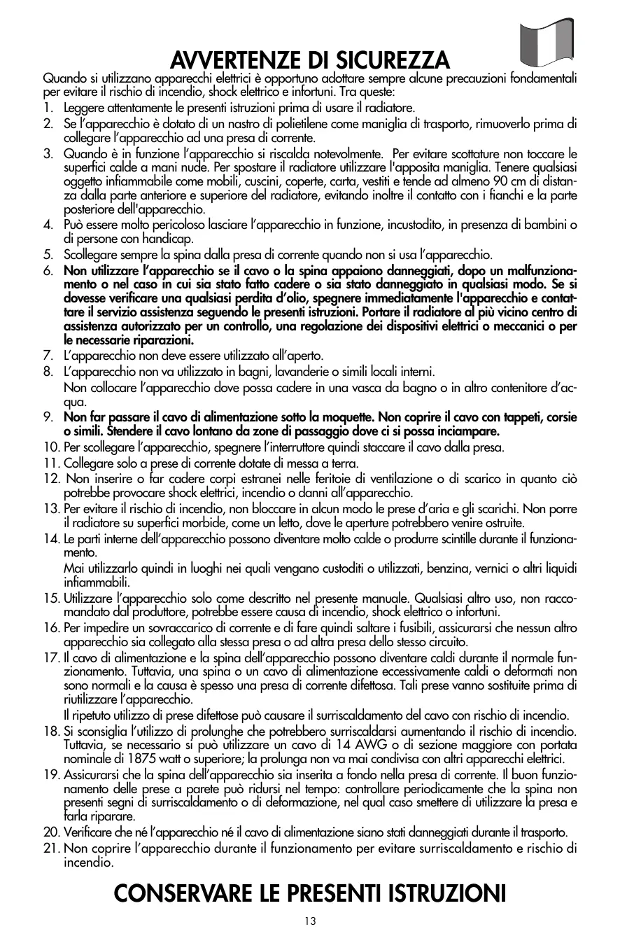 AVVERTENZE DI SICUREZZA Quando si utilizzano apparecchi elettrici è opportuno adottare sempre alcune precauzioni fondamentali per evitare il rischio di incendio, shock elettrico e infortuni. Tra queste: 1. Leggere attentamente le presenti istruzioni prima di usare il radiatore. 2. Se l’apparecchio è dotato di un nastro di polietilene come maniglia di trasporto, rimuoverlo prima di collegare l’apparecchio ad una presa di corrente. 3. Quando è in funzione l’apparecchio si riscalda notevolmente. Per evitare scottature non toccare le superfici calde a mani nude. Per spostare il radiatore utilizzare l'apposita maniglia. Tenere qualsiasi oggetto infiammabile come mobili, cuscini, coperte, carta, vestiti e tende ad almeno 90 cm di distanza dalla parte anteriore e superiore del radiatore, evitando inoltre il contatto con i fianchi e la parte posteriore dell'apparecchio. 4. Può essere molto pericoloso lasciare l’apparecchio in funzione, incustodito, in presenza di bambini o di persone con handicap. 5. Scollegare sempre la spina dalla presa di corrente quando non si usa l’apparecchio. 6. Non utilizzare l’apparecchio se il cavo o la spina appaiono danneggiati, dopo un malfunzionamento o nel caso in cui sia stato fatto cadere o sia stato danneggiato in qualsiasi modo. Se si dovesse verificare una qualsiasi perdita d’olio, spegnere immediatamente l'apparecchio e contattare il servizio assistenza seguendo le presenti istruzioni. Portare il radiatore al più vicino centro di assistenza autorizzato per un controllo, una regolazione dei dispositivi elettrici o meccanici o per le necessarie riparazioni. 7. L’apparecchio non deve essere utilizzato all’aperto. 8. L’apparecchio non va utilizzato in bagni, lavanderie o simili locali interni. Non collocare l’apparecchio dove possa cadere in una vasca da bagno o in altro contenitore d’acqua. 9. Non far passare il cavo di alimentazione sotto la moquette. Non coprire il cavo con tappeti, corsie o simili. Stendere il cavo lontano da zone di passaggio dove ci si possa inciampare. 10. Per scollegare l’apparecchio, spegnere l’interruttore quindi staccare il cavo dalla presa. 11. Collegare solo a prese di corrente dotate di messa a terra. 12. Non inserire o far cadere corpi estranei nelle feritoie di ventilazione o di scarico in quanto ciò potrebbe provocare shock elettrici, incendio o danni all’apparecchio. 13. Per evitare il rischio di incendio, non bloccare in alcun modo le prese d’aria e gli scarichi. Non porre il radiatore su superfici morbide, come un letto, dove le aperture potrebbero venire ostruite. 14. Le parti interne dell’apparecchio possono diventare molto calde o produrre scintille durante il funzionamento. Mai utilizzarlo quindi in luoghi nei quali vengano custoditi o utilizzati, benzina, vernici o altri liquidi infiammabili. 15. Utilizzare l’apparecchio solo come descritto nel presente manuale. Qualsiasi altro uso, non raccomandato dal produttore, potrebbe essere causa di incendio, shock elettrico o infortuni. 16. Per impedire un sovraccarico di corrente e di fare quindi saltare i fusibili, assicurarsi che nessun altro apparecchio sia collegato alla stessa presa o ad altra presa dello stesso circuito. 17. Il cavo di alimentazione e la spina dell’apparecchio possono diventare caldi durante il normale funzionamento. Tuttavia, una spina o un cavo di alimentazione eccessivamente caldi o deformati non sono normali e la causa è spesso una presa di corrente difettosa. Tali prese vanno sostituite prima di riutilizzare l’apparecchio. Il ripetuto utilizzo di prese difettose può causare il surriscaldamento del cavo con rischio di incendio. 18. Si sconsiglia l’utilizzo di prolunghe che potrebbero surriscaldarsi aumentando il rischio di incendio. Tuttavia, se necessario si può utilizzare un cavo di 14 AWG o di sezione maggiore con portata nominale di 1875 watt o superiore; la prolunga non va mai condivisa con altri apparecchi elettrici. 19. Assicurarsi che la spina dell’apparecchio sia inserita a fondo nella presa di corrente. Il buon funzionamento delle prese a parete può ridursi nel tempo: controllare periodicamente che la spina non presenti segni di surriscaldamento o di deformazione, nel qual caso smettere di utilizzare la presa e farla riparare. 20. Verificare che né l’apparecchio né il cavo di alimentazione siano stati danneggiati durante il trasporto. 21. Non coprire l’apparecchio durante il funzionamento per evitare surriscaldamento e rischio di incendio.