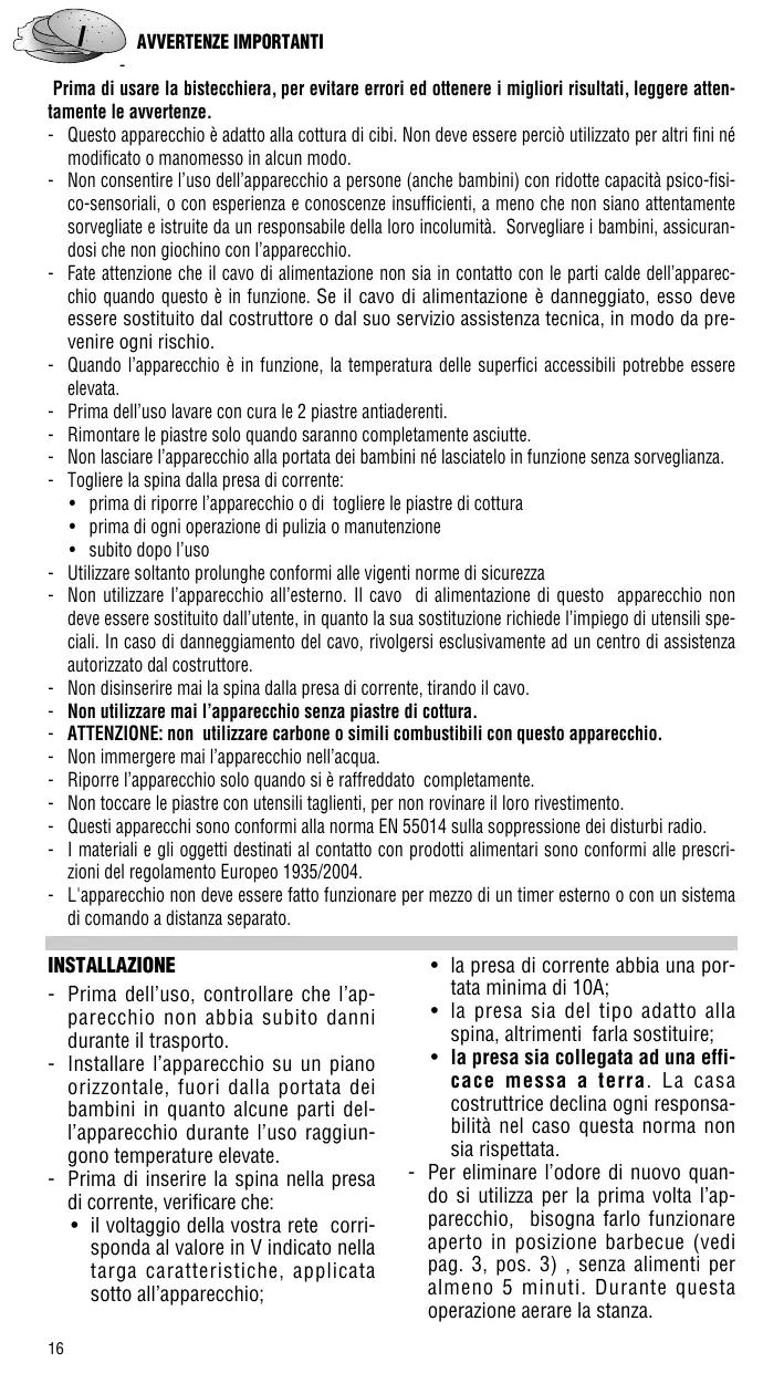 - subito dopo l’uso - Utilizzare soltanto prolunghe conformi alle vigenti norme di sicurezza - Non utilizzare l’apparecchio all’esterno. Il cavo di alimentazione di questo apparecchio non deve essere sostituito dall’utente, in quanto la sua sostituzione richiede l’impiego di utensili speciali. In caso di danneggiamento del cavo, rivolgersi esclusivamente ad un centro di assistenza autorizzato dal costruttore. - Non disinserire mai la spina dalla presa di corrente, tirando il cavo. - Non utilizzare mai l’apparecchio senza piastre di cottura. - ATTENZIONE: non utilizzare carbone o simili combustibili con questo apparecchio. - Non immergere mai l’apparecchio nell’acqua. - Riporre l’apparecchio solo quando si è raffreddato completamente. - Non toccare le piastre con utensili taglienti, per non rovinare il loro rivestimento. - Questi apparecchi sono conformi alla norma EN 55014 sulla soppressione dei disturbi radio. - I materiali e gli oggetti destinati al contatto con prodotti alimentari sono conformi alle prescrizioni del regolamento Europeo 1935/2004. - L'apparecchio non deve essere fatto funzionare per mezzo di un timer esterno o con un sistema di comando a distanza separato. INSTALLAZIONE - Prima dell’uso, controllare che l’apparecchio non abbia subito danni durante il trasporto. - Installare l’apparecchio su un piano orizzontale, fuori dalla portata dei bambini in quanto alcune parti dell’apparecchio durante l’uso raggiungono temperature elevate. - Prima di inserire la spina nella presa di corrente, verificare che: