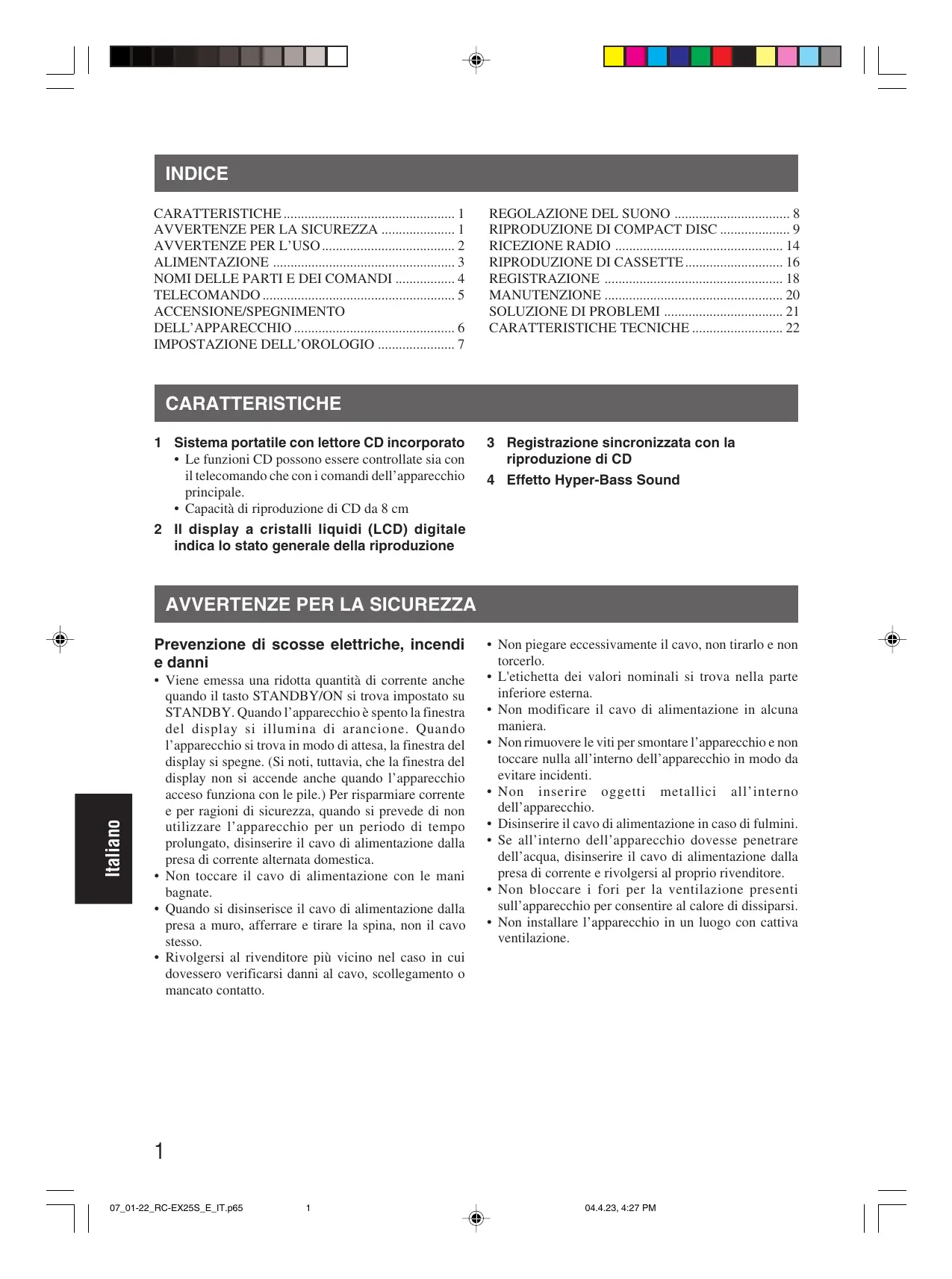 - Estrarre le pile quando si trasporta l’apparecchio a mano o nel bagagliaio di un’automobile. Ciò evita che l’apparecchio si accenda accidentalmente consumando inutilmente le pile. Per spegnere completamente l’apparecchio Disinserire il cavo di alimentazione CA dalla presa di corrente continua. Estrarre le pile, se queste si trovano inserite. 07_01-22_RC-EX25S_E_IT.p65