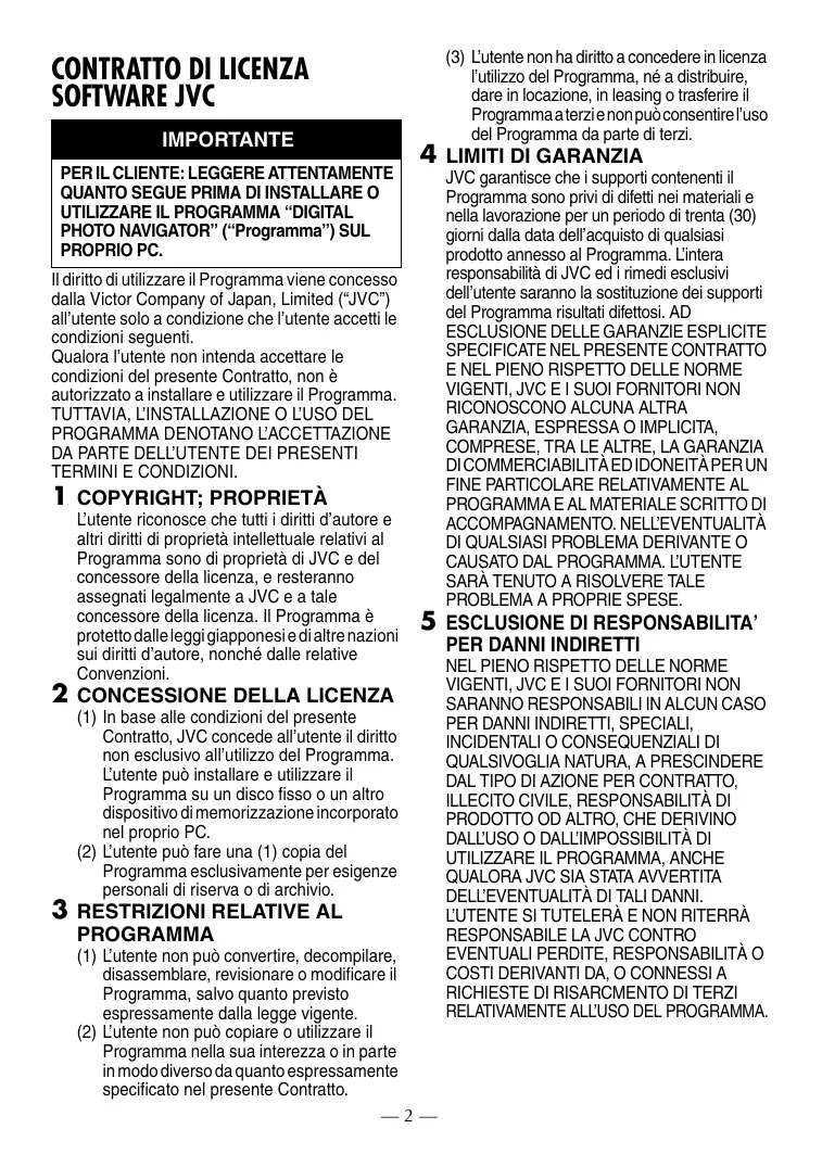 PHOTO NAVIGATOR” (“Programma”) SUL PROPRIO PC. I dirito di utizzare il Programma viene concesso dalla Victor Company of Japan, Limited (“JVC”) all’utente solo a condizione che l'utente accetti le condizioni seguenti. Qualora l'utente non intenda accettare le condizioni del presente Contratto, non à autorizzato a installare e utilizzare il Programma.