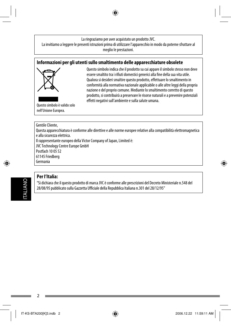 Italiano: Con la presente JVC dichiara che questo KS-BTA200 à conforme ai requisiti essenziali ed alle altre disposizioni pertinenti stabilite dalla direttiva 1999/5/CE.